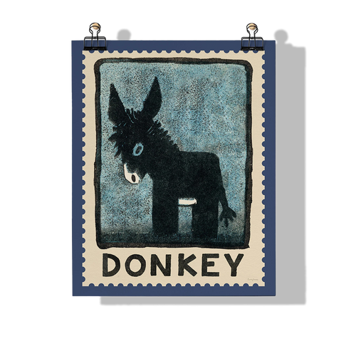 Featuring a charming vintage donkey illustration by French painter André Hellé, first published in a children's book in 1926, our designers have reimagined Hellé original artwork and created this unique vintage postage stamp themed fine art print with new added text and a blue coloured background. Giclée printed on 200gsm museum quality paper with a textured, matt finish.