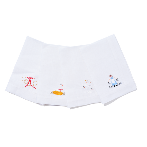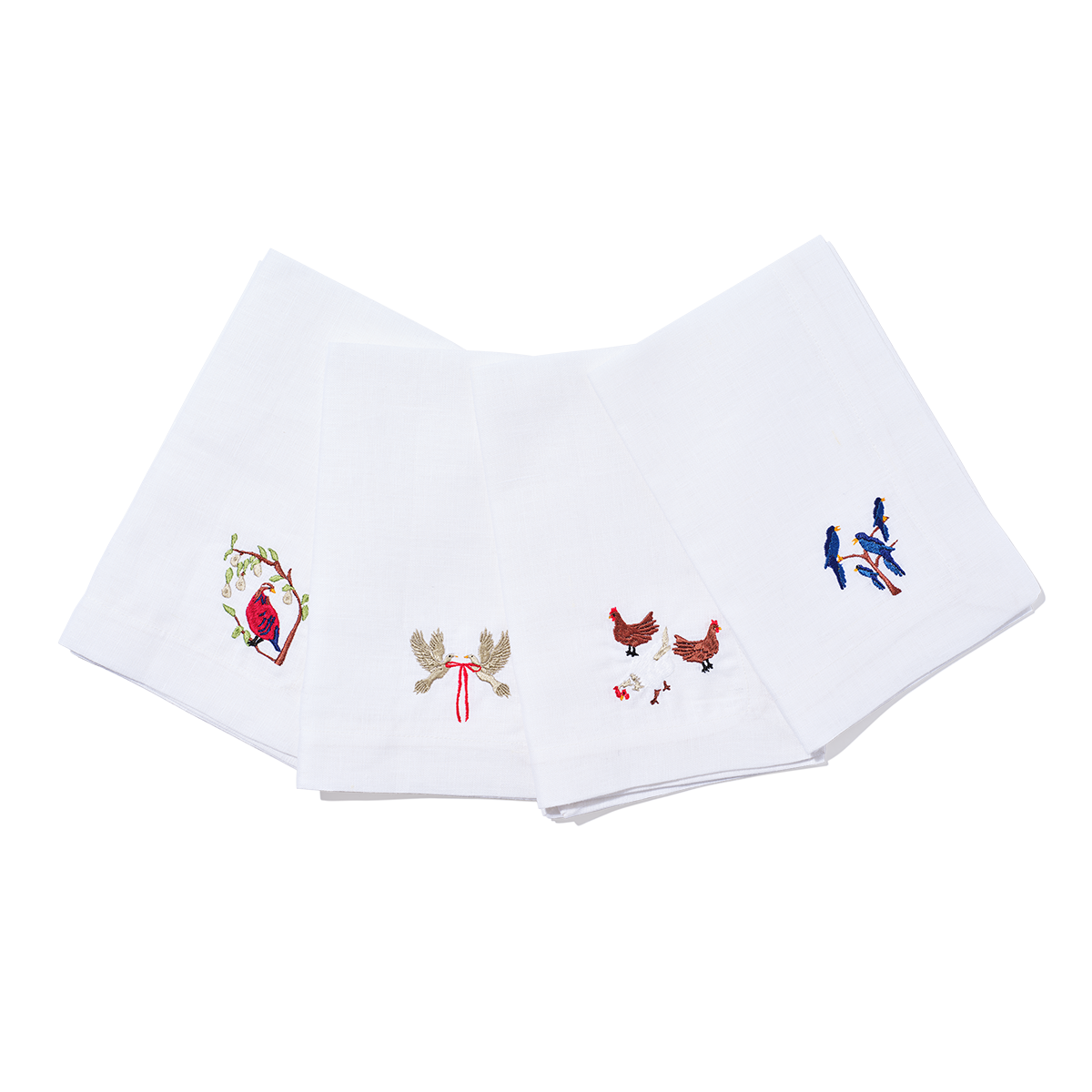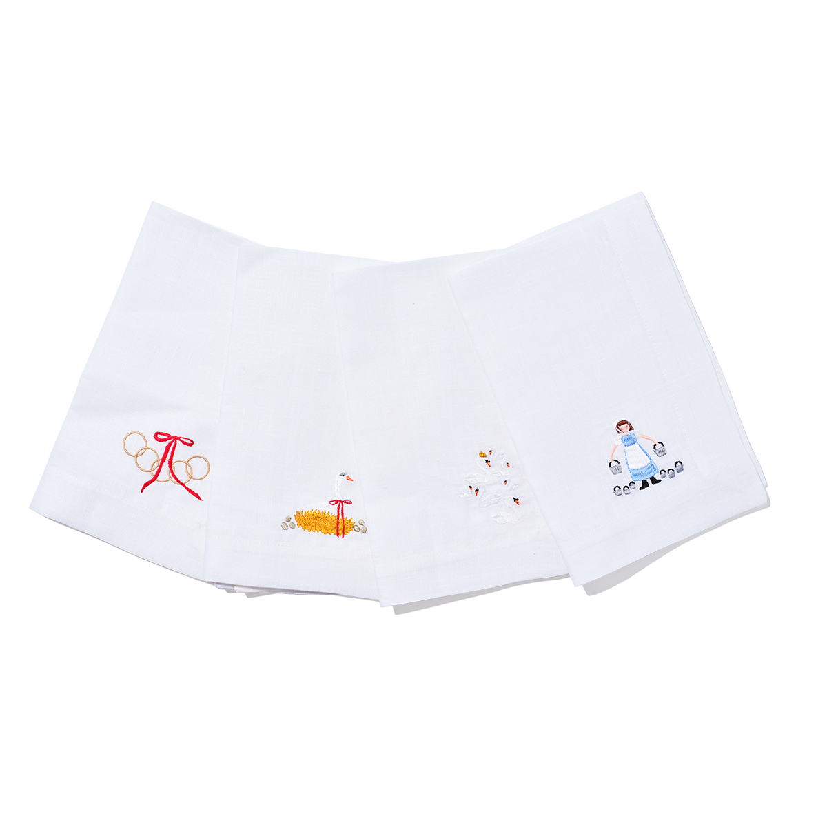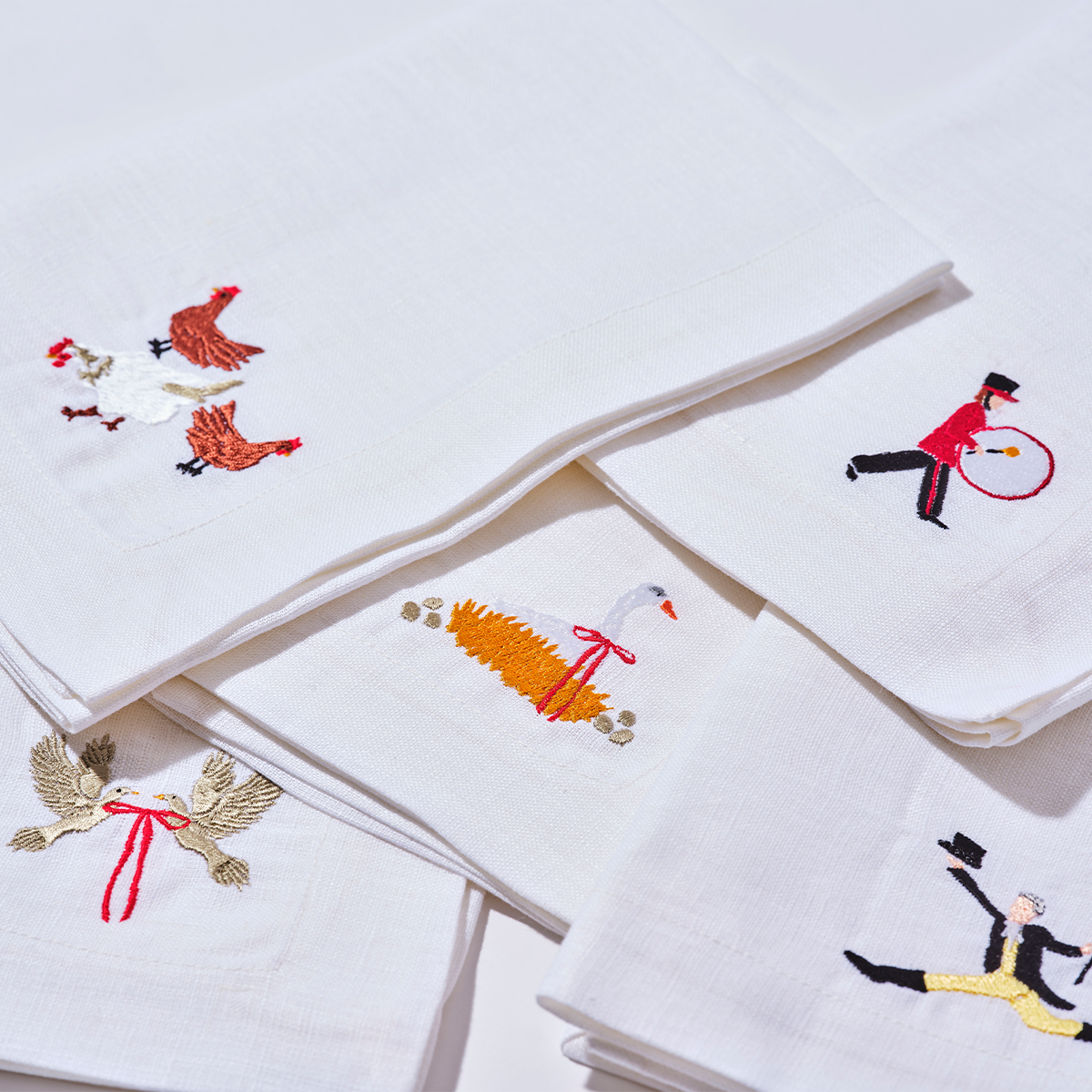Inspired by the Twelfth Night Christmas carol, our bestselling linen napkins are now available as a limited edition set of 12, each beautifully hand embroidered and designed in-house with motifs from the song. From lords leaping to maids milking, this enchanting set will bring joy and nostalgia to your table for years to come.