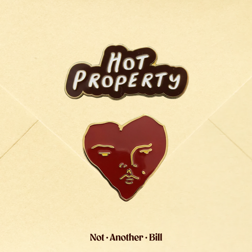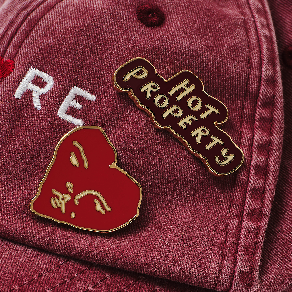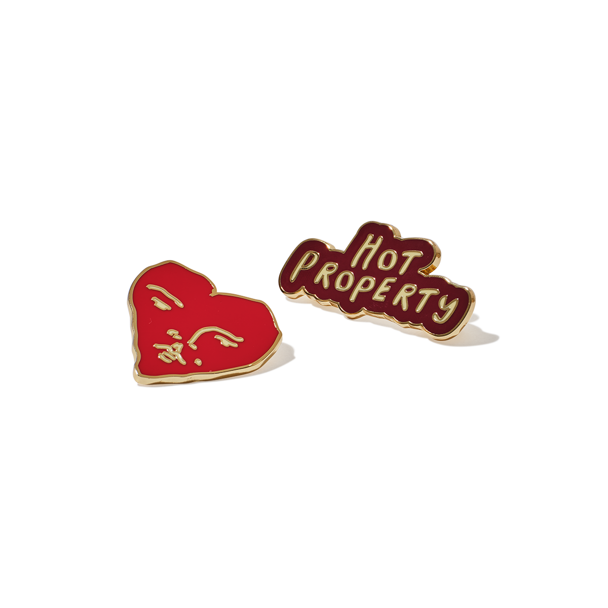 Make a bold statement with this playful enamel pin set, featuring a vibrant red heart and a matching “Hot Property” design, each detailed with polished gold-tone edging. Made from durable metal with a smooth enamel finish and secure back fastenings, they’re an easy way to add personality to jackets, bags, or hats.