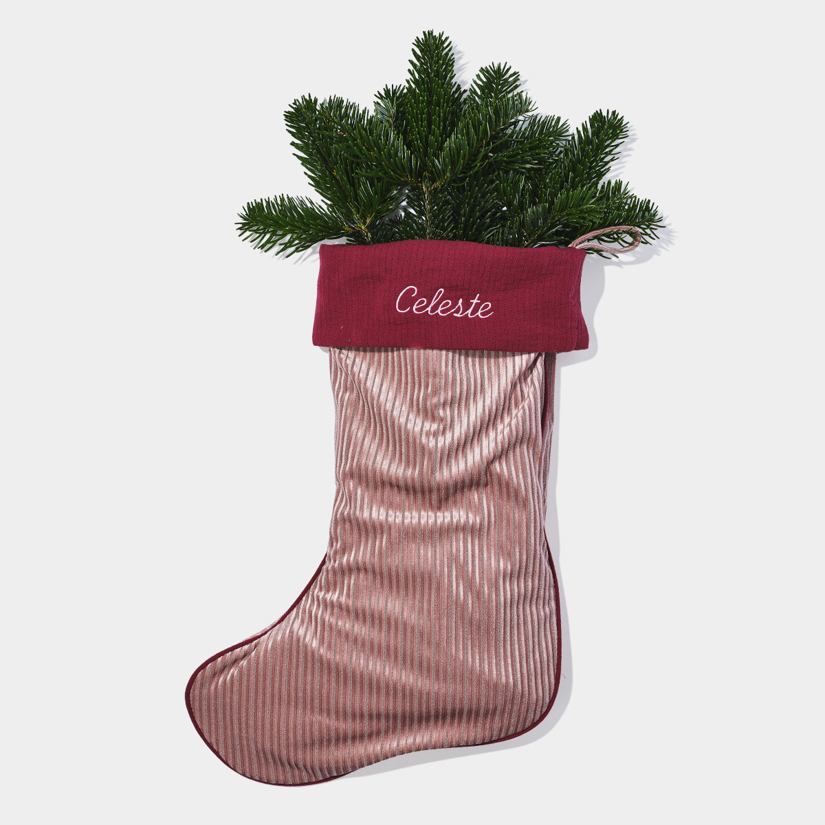 Our Christmas Stocking is luxuriously crafted with a metallic velvet outer and organic cotton lining, with contrasting piping and a velvet loop for hanging above your fireplace. Make it truly special with an embroidered name for a seasonal look that remains timeless.