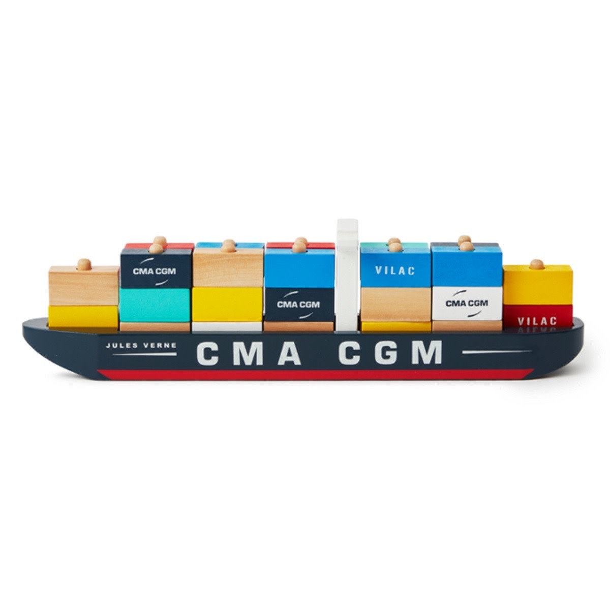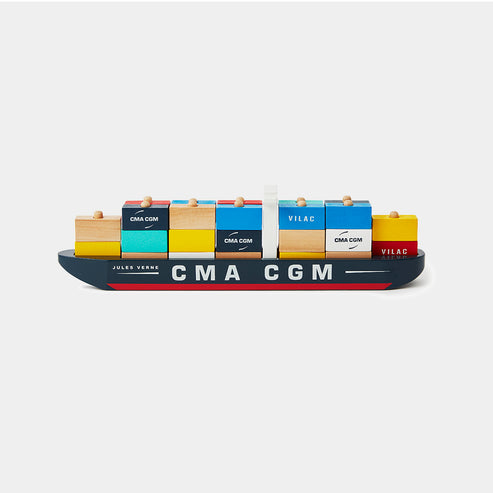 Ideal for developing motor skills and encouraging imaginative play, little ones can prepare the cargo for launch of this CMA CGM Jules Verne Container Ship by stacking the wooden cubes.