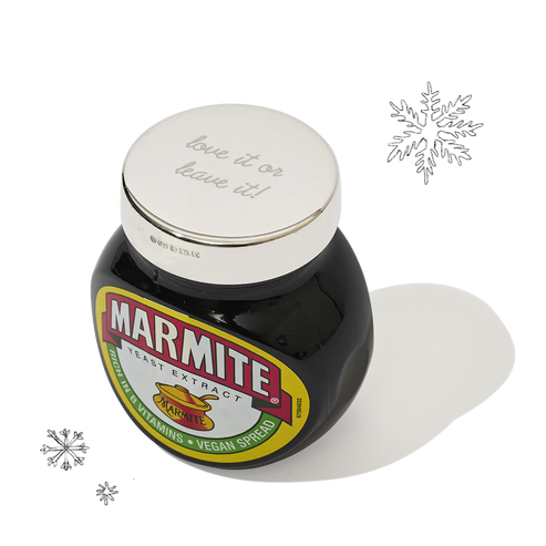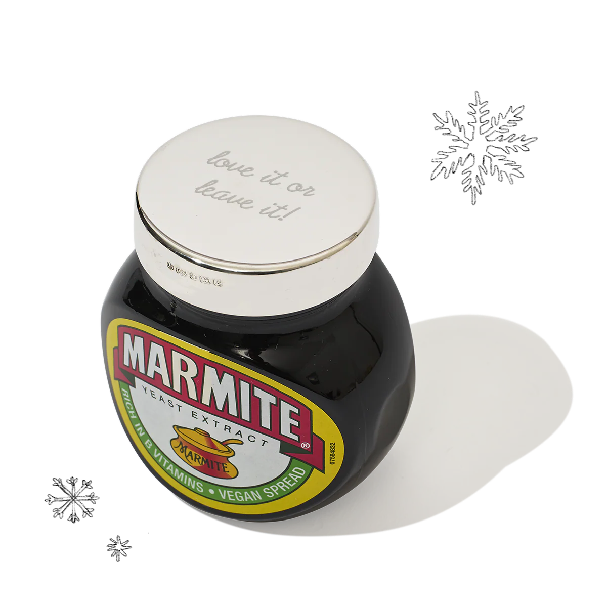 A Sterling Silver lid to fit a 250g jar of either loving or loathing - yes, it's Marmite. Handcrafted in Birmingham's prestigious silver quarter, each 250g Marmite lid is stamped with British Assay hallmarks and can be personalized with a name, date, or special message. The ultimate present for the person who has everything or to elevate your own condiment collection. The lid comes on a Marmite jar and can be transferred to a new jar once the first one is empty.