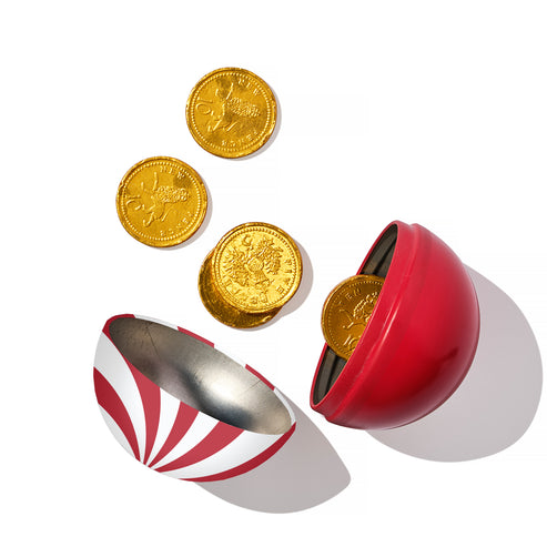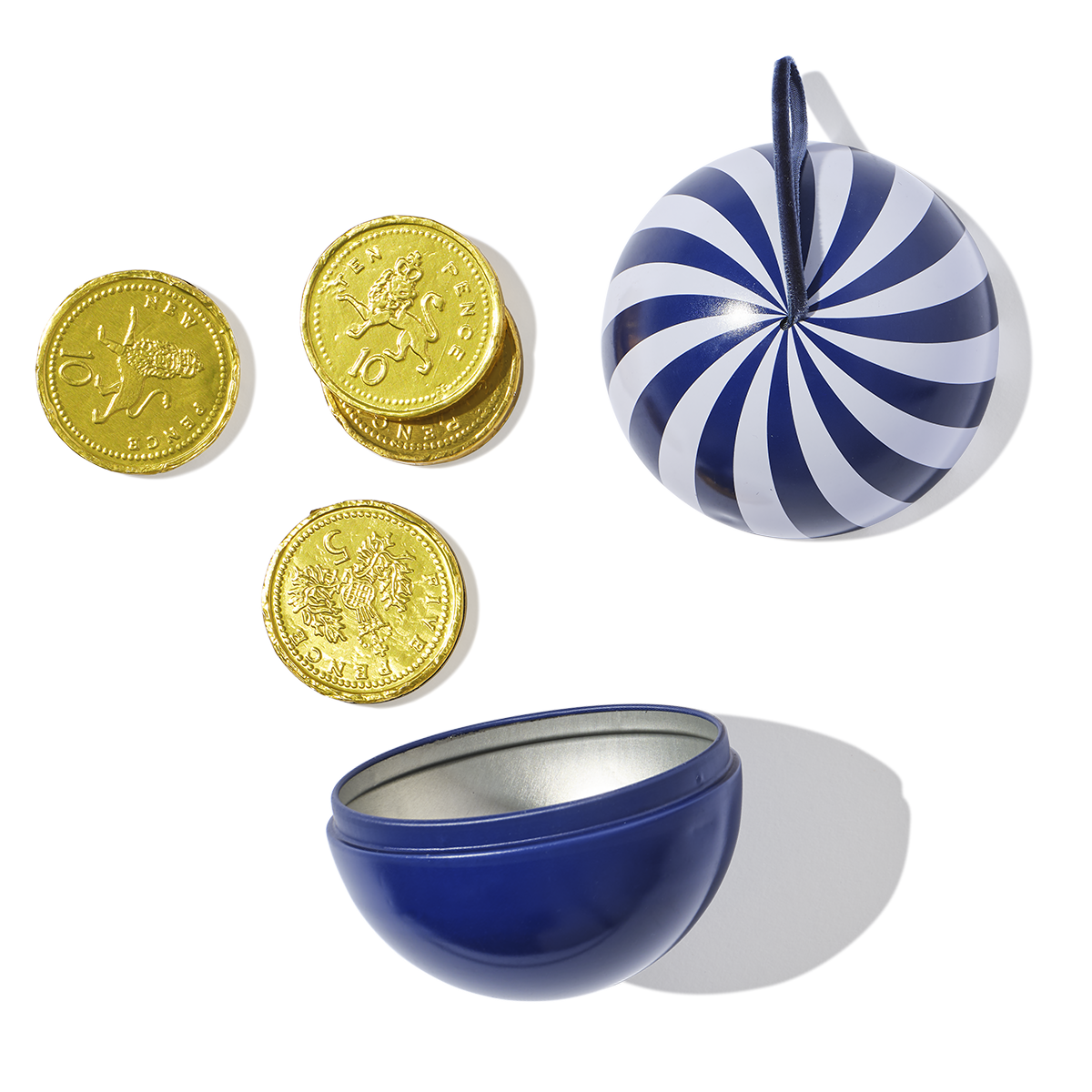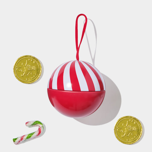 Chocolate coins, perfect for festive fun! Nestled inside a shimmering metal bauble, these delicious treats are a delightful surprise. Ideal for Christmas stockings, advent calendars, or as a standalone gift. A sweet and stylish way to spread holiday cheer.