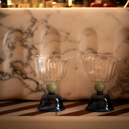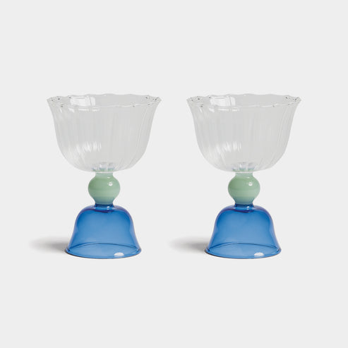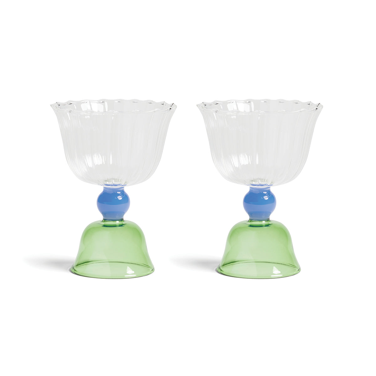 The green tulip glasses are designed to steal the show on your table. Curved and wavy shapes combine with clear blue and green tones to give the set an elegant look. Enjoy your favourite drink in style with these glasses.