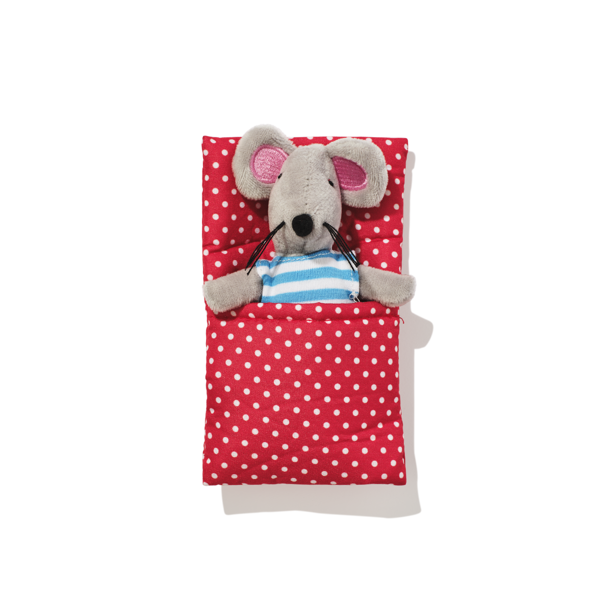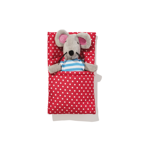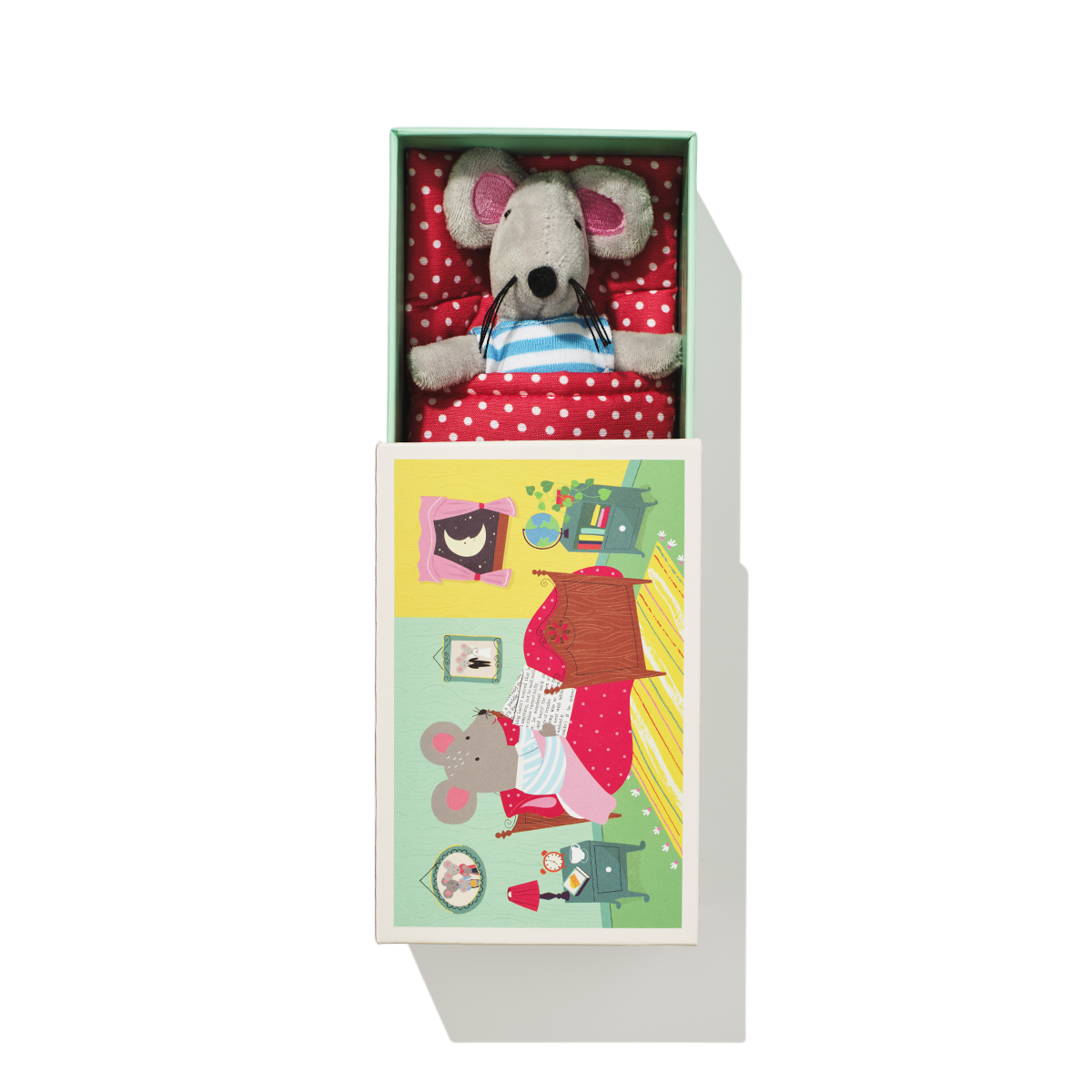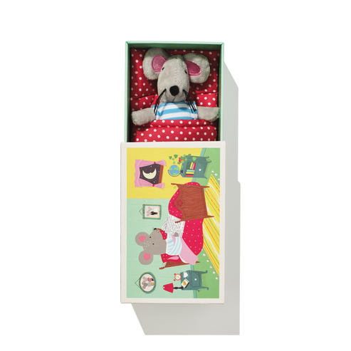 This mouse soft toy is just so adorable with its striped shirt and red polka dot blanket. It comes in a gift box wonderfully illustrated with the cosy details of its home!