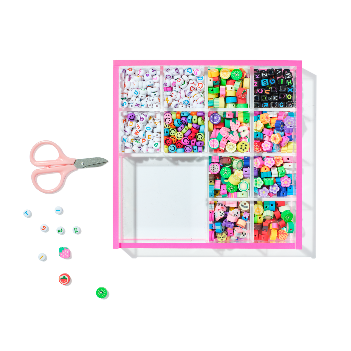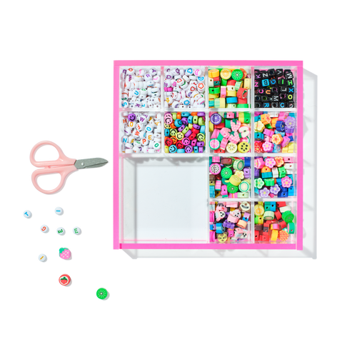Spark your child’s creativity with this fun make your own jewellery kit. Housed in a clear acrylic box, it includes colourful beads featuring animals, fruits, and alphabet letters, plus string and mini scissors. Perfect for making personalised bracelets, necklaces, and more; this kit encourages imaginative play and helps develop fine motor skills. Personalise the lid with a message or name for an extra special touch.