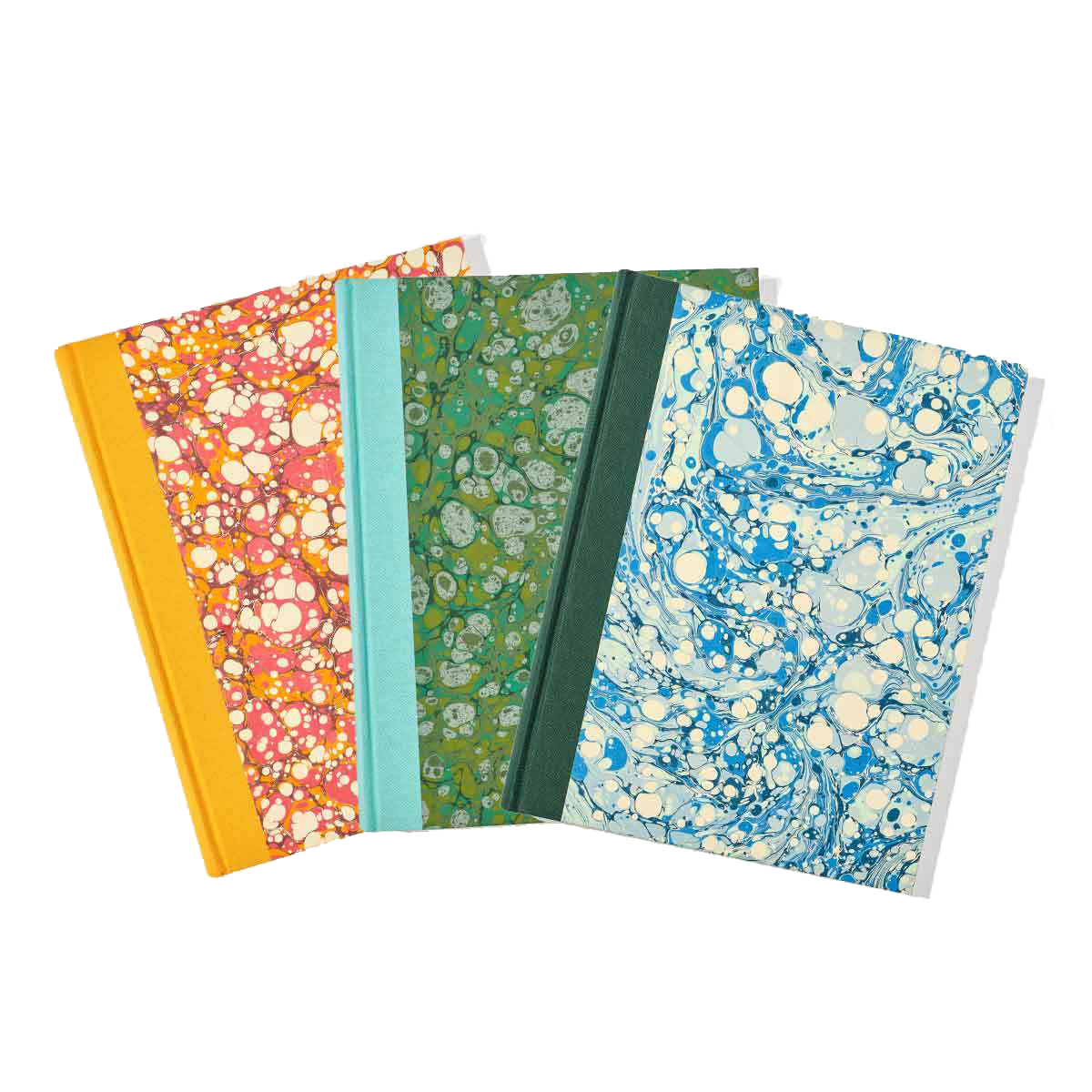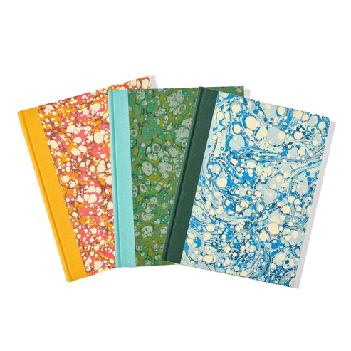 The papers we have designed are a fresh and fun take on the traditional marbling, and are beautifully finished with a linen spine that will add a pop of colour to your bookshelf.