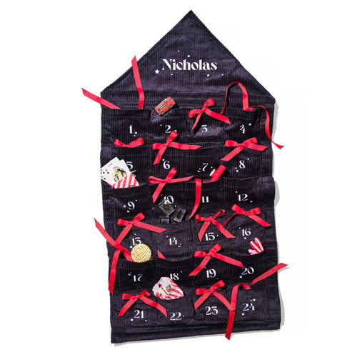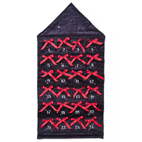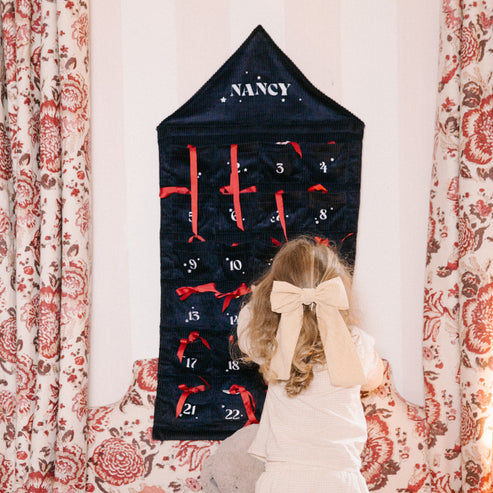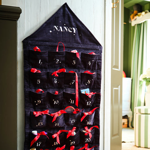 For the little ones, the months leading up to Father Christmas visit can be just as special as the day itself. Add a little magic to the daily countdown with our wall hanging Advent Calendar. Our calendar is a timeless take on the advent tradition, made from the softest corduroy. A pocket for each day with stripe lining and held closed with ruby red ribbon. Embroidered with stars, moons and personalised with the little ones name, for a truly magical touch.