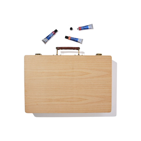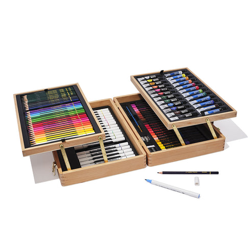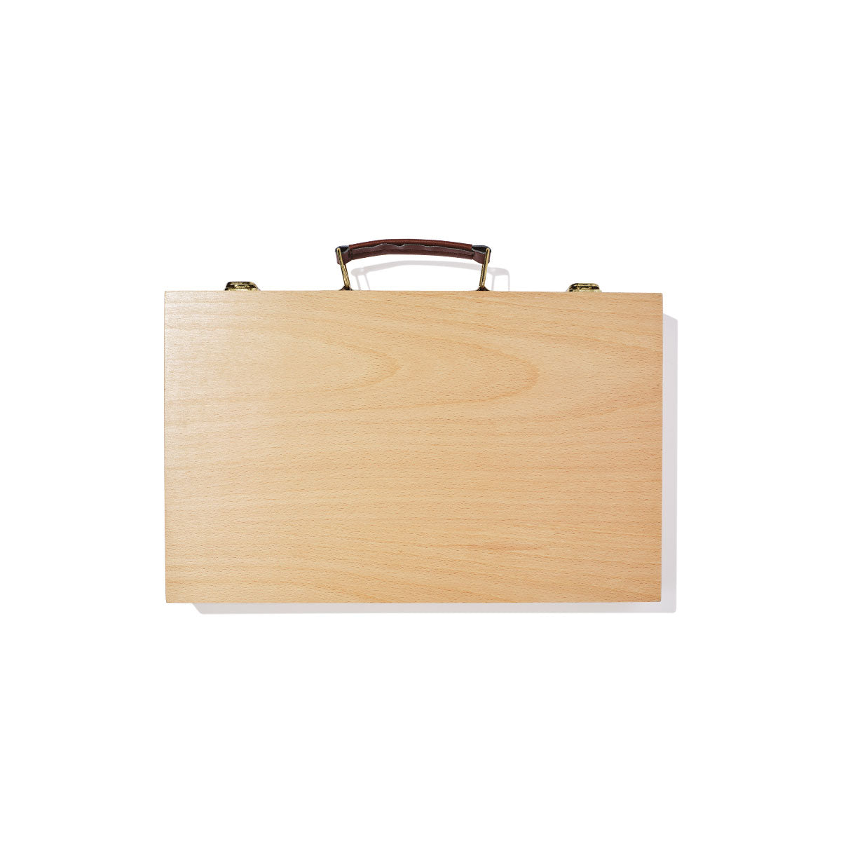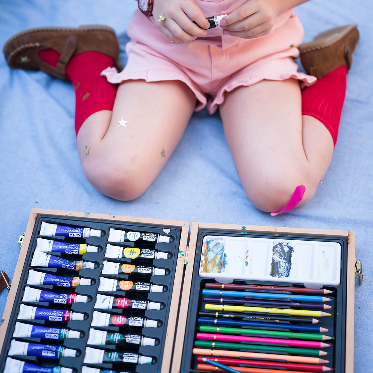The smaller set includes acrylic paints, watercolours, pencils and pens, as well as a rubber and pencil sharpener. The beechwood cases have a carry handle and ideal for taking on trips and art adventures. The personalisation will be engraved to the outside of the case.