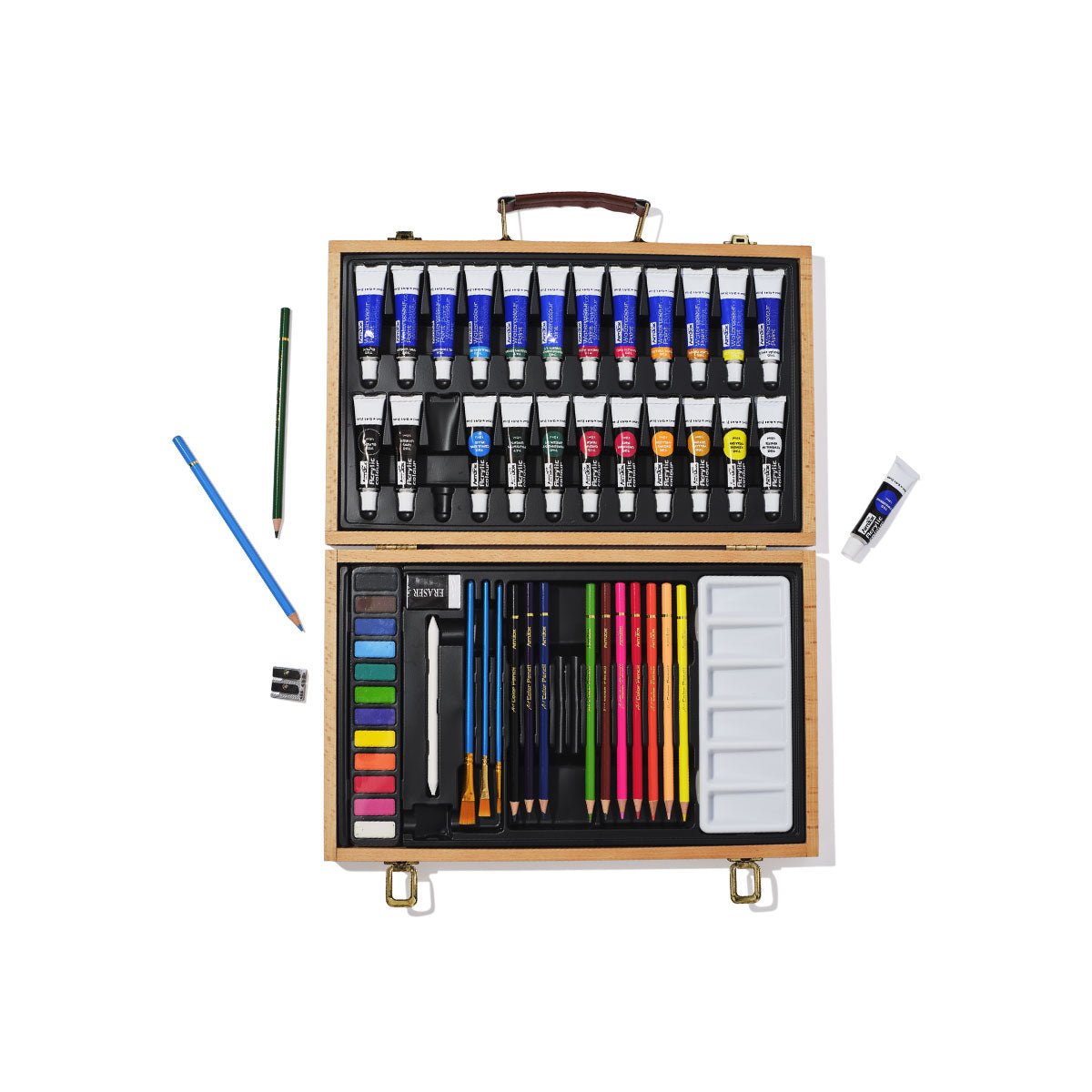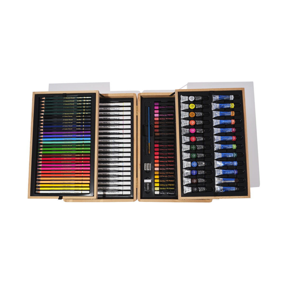Our large art box comes complete with acrylic paints, pastels, pencils and pens, as well as a rubber and pencil sharpener.