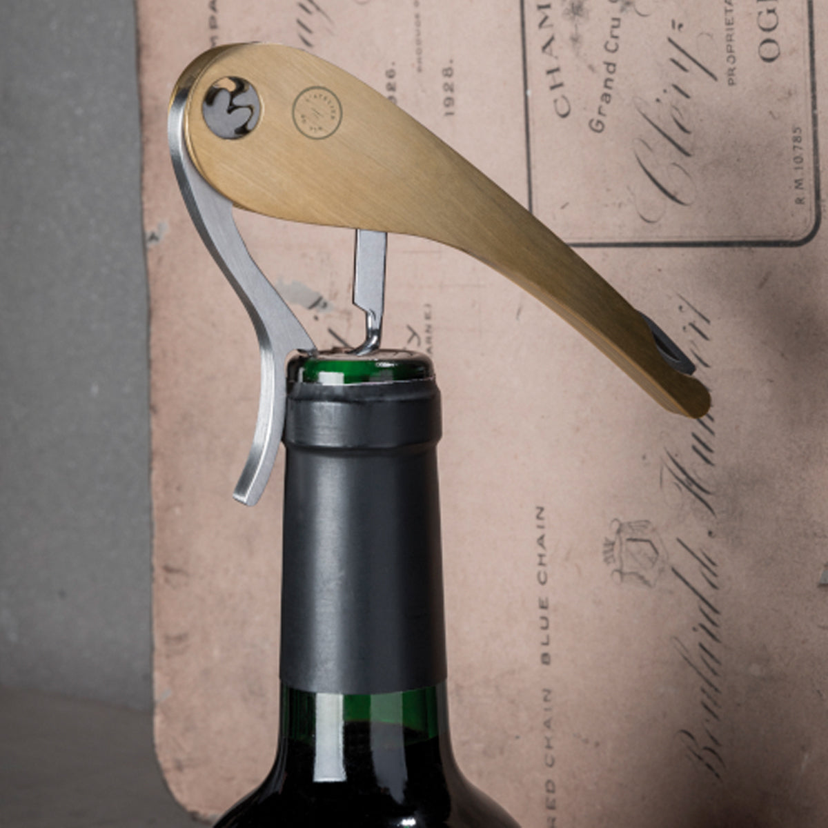 This beautiful brass corkscrew extracts the cork from your bottle in only one move, in a completely fluid and continuous way, thanks to its unique gear system. The cork is pulled out vertically, without any torsion or effort minimizing any damage to the cork. On the opposite edge there is a foil cutting-blade and a bottle opener.