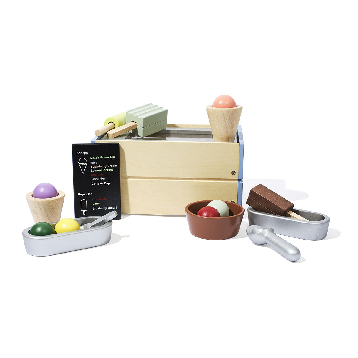 Recreate the magic of the ice cream shop with this unique wooden set. Complete with scoops, cones and menu - and fitting neatly in a wooden box - this set is the perfect gift for imaginative toddlers.