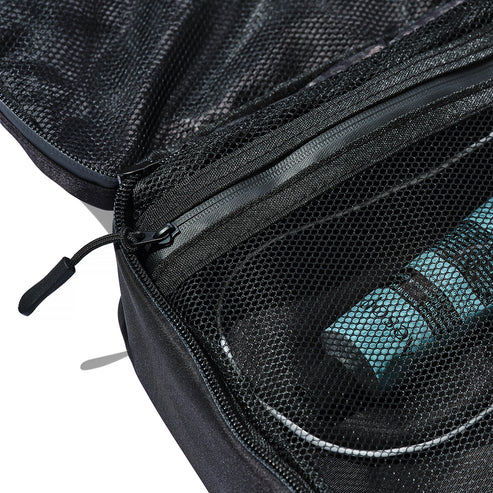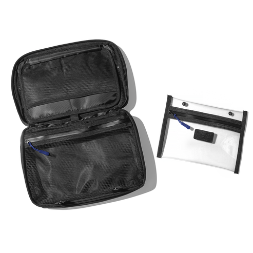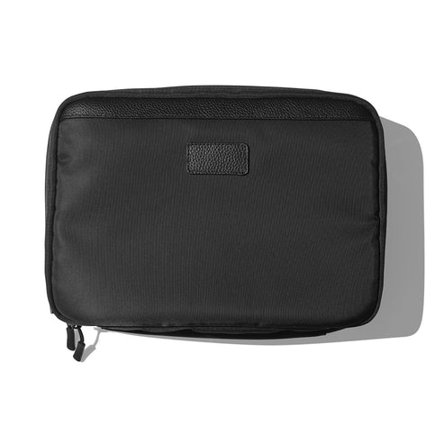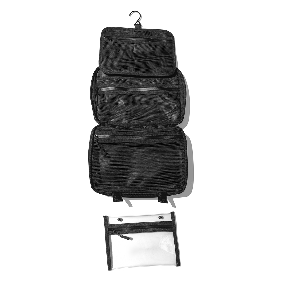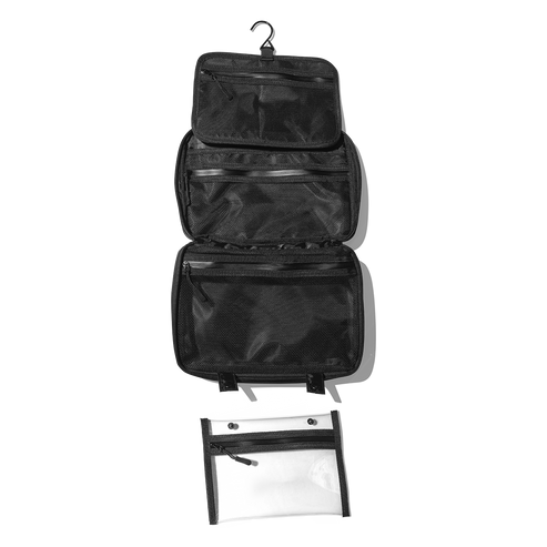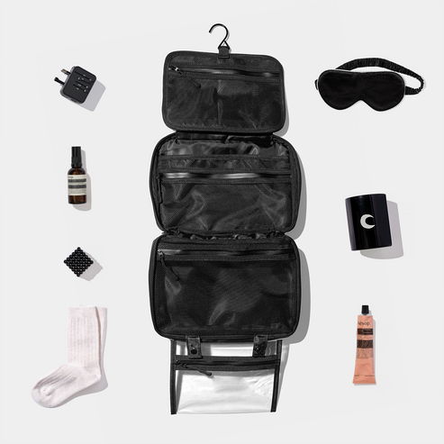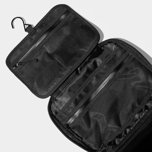 Streamline your travel ensemble in style with our new hanging washbag. Crafted from recycled (RPET) nylon and luxe pebble grain leather trim, this neat accessory has handy compartments for all your toiletry and travel essentials as well as a removable bag so that liquids can be displayed at airport security.