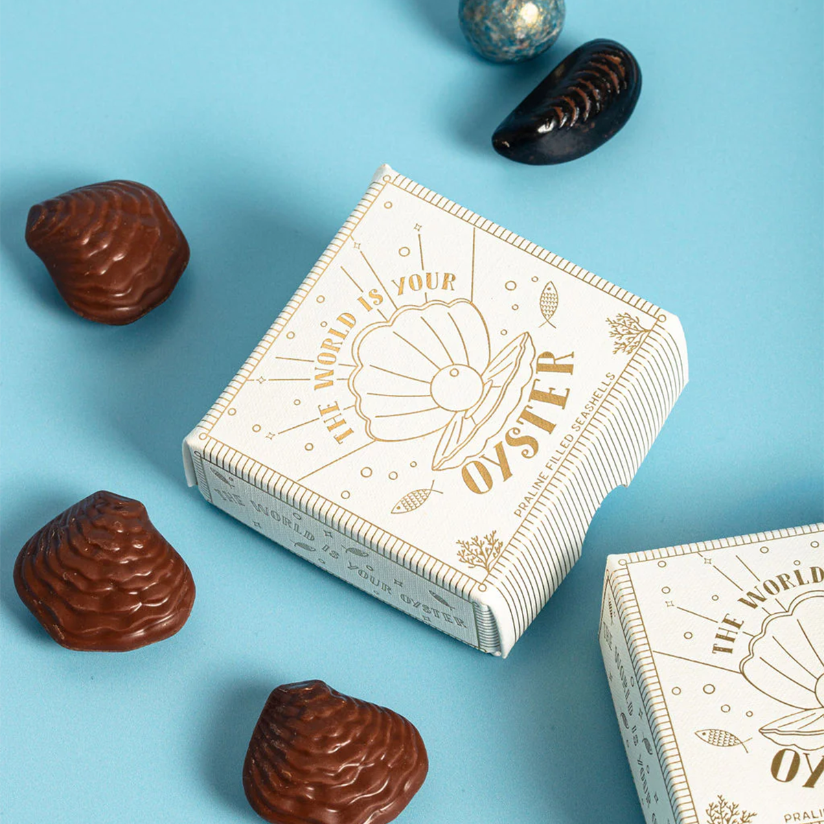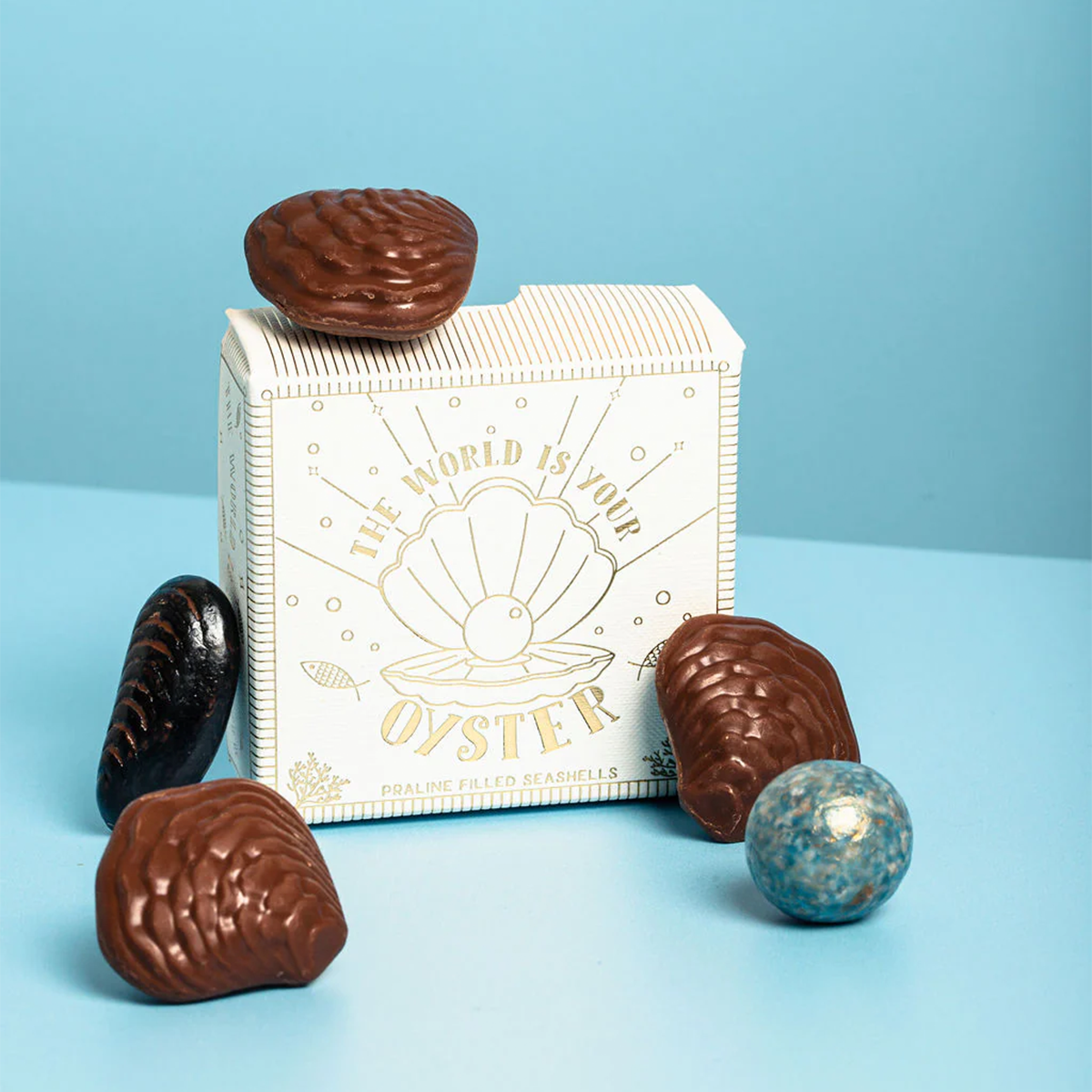 'The World is Your Oyster!' celebrate wonderful achievements and milestones with a  beautifully original gift. A selection of praline seashells and one chocolate oyster.