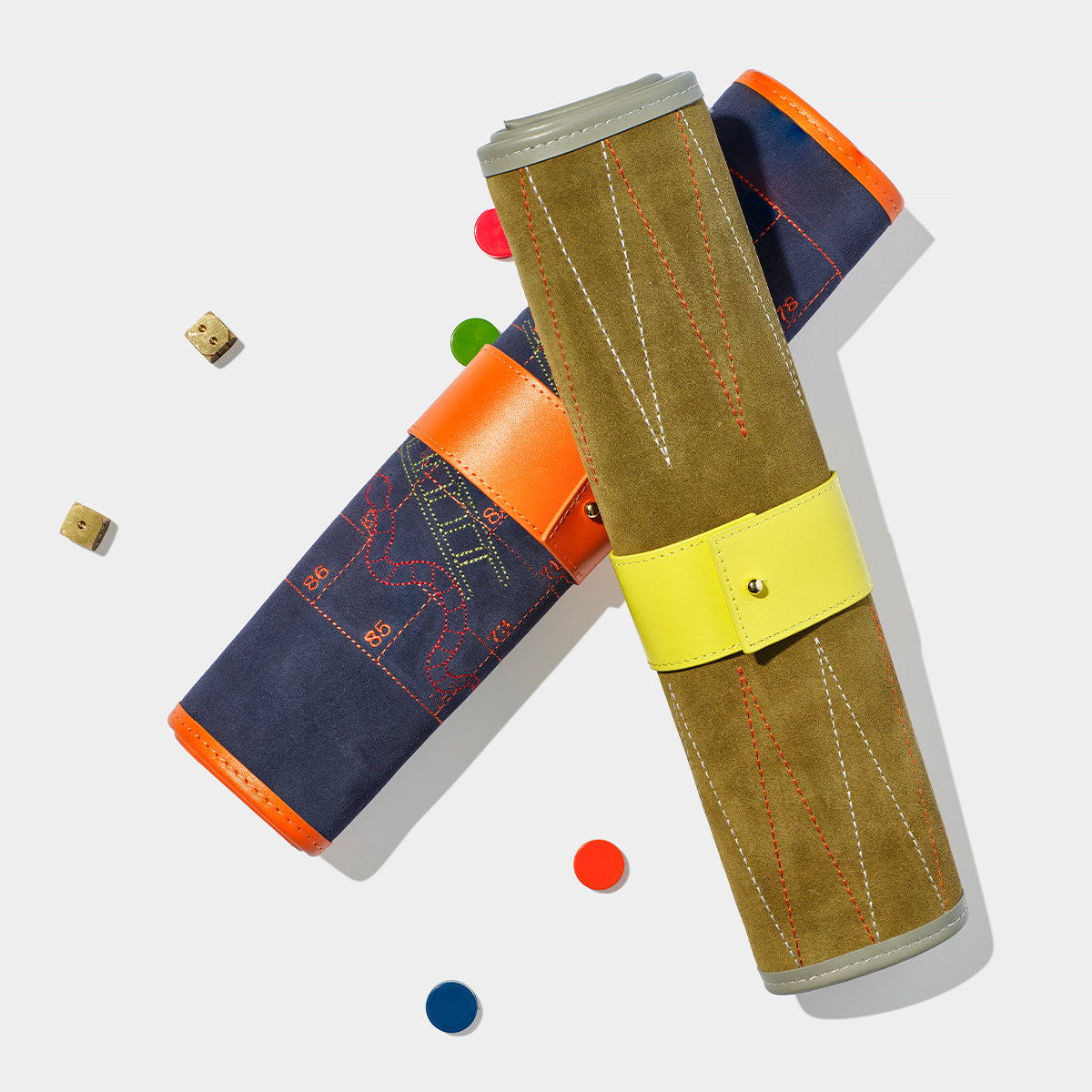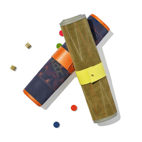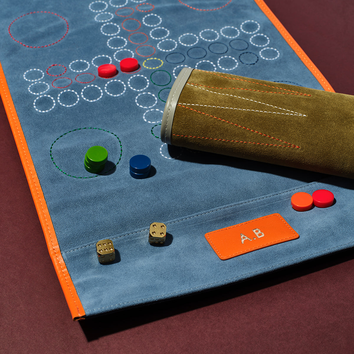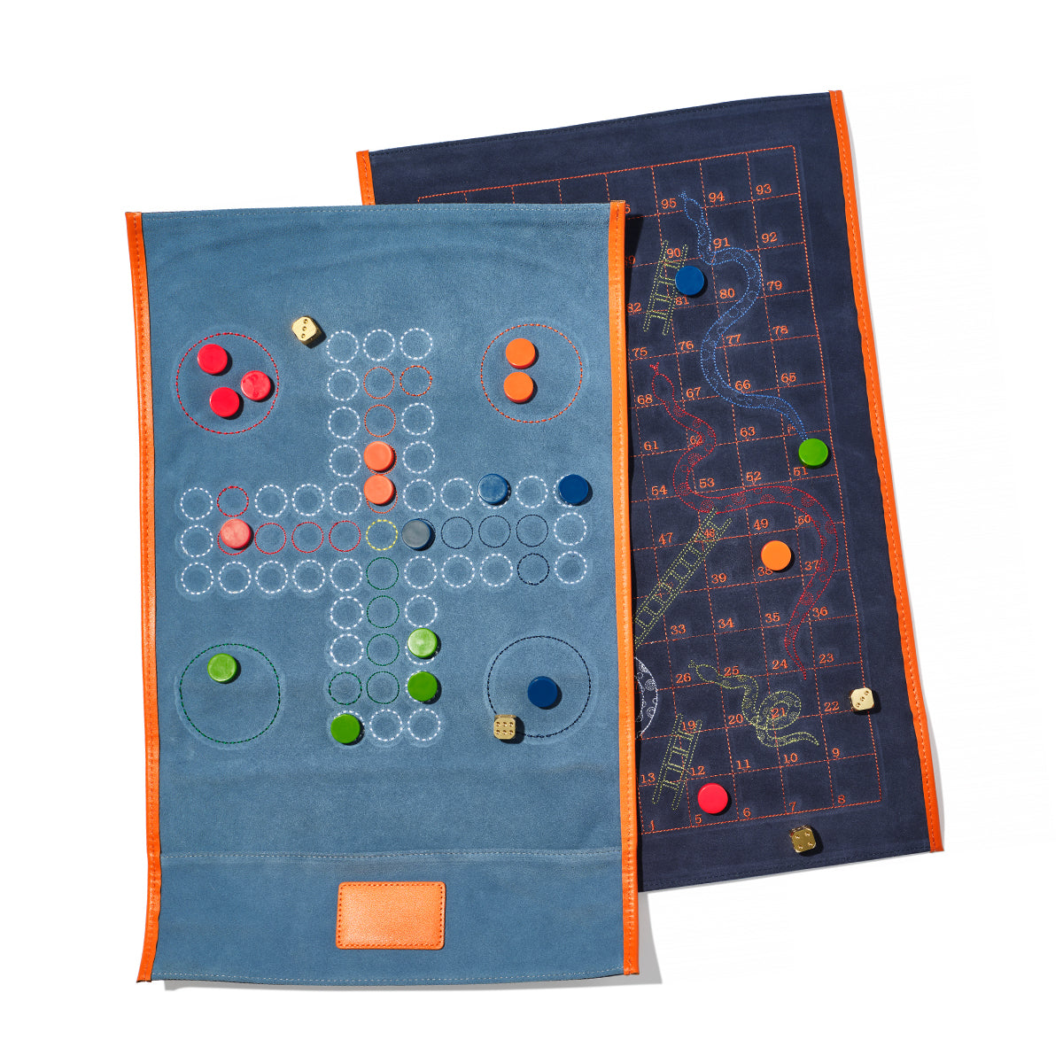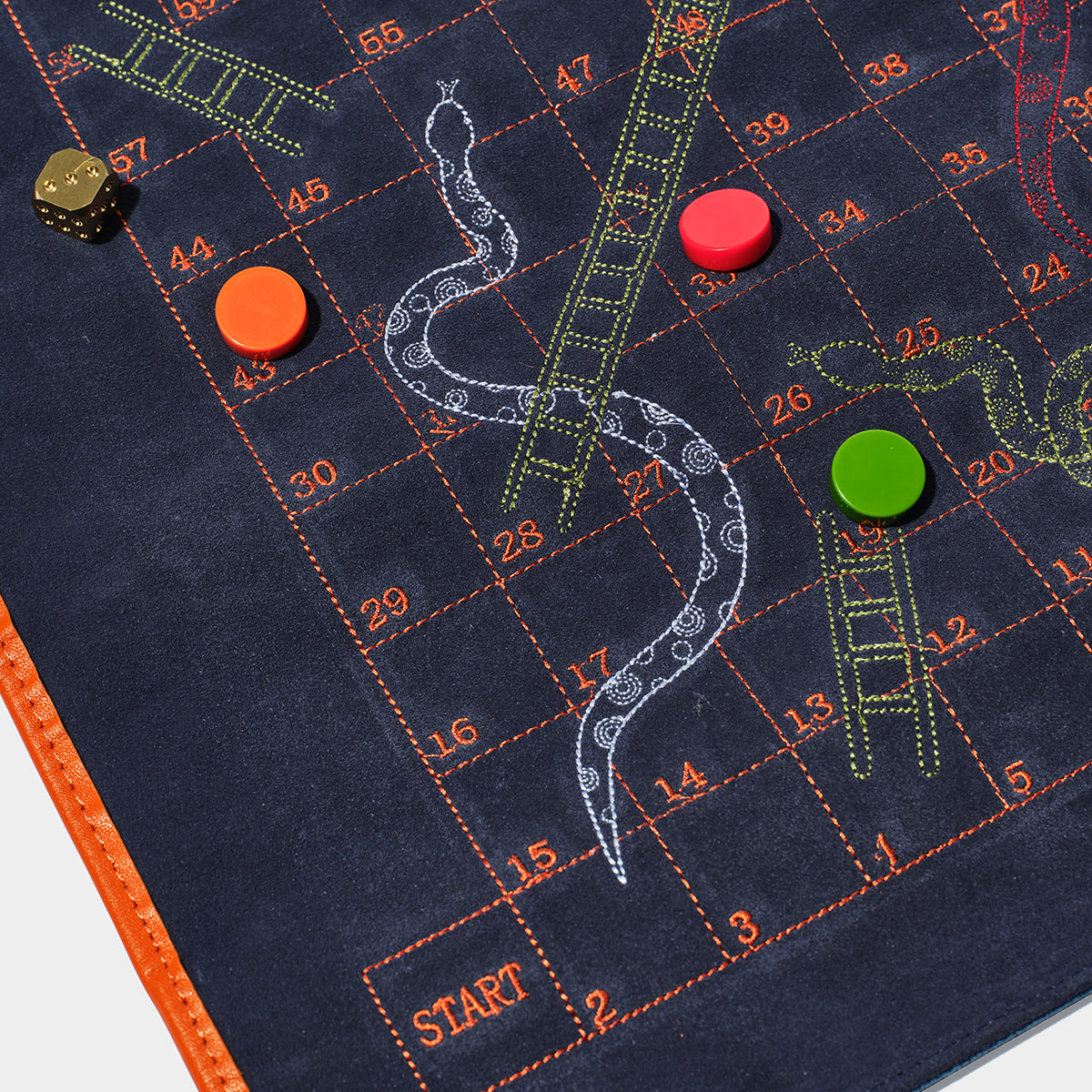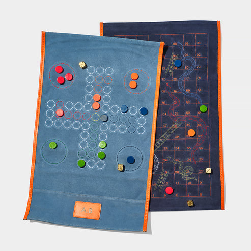 This luxury games roll is crafted from premium suede and leather, with intricate embroidery detailing, ensuring you can play a game of snakes & ladders or ludo in sophisticated style. Enjoy timeless entertainment with a classic touch.
