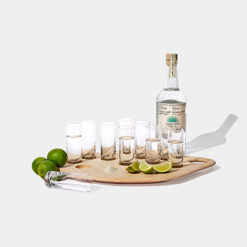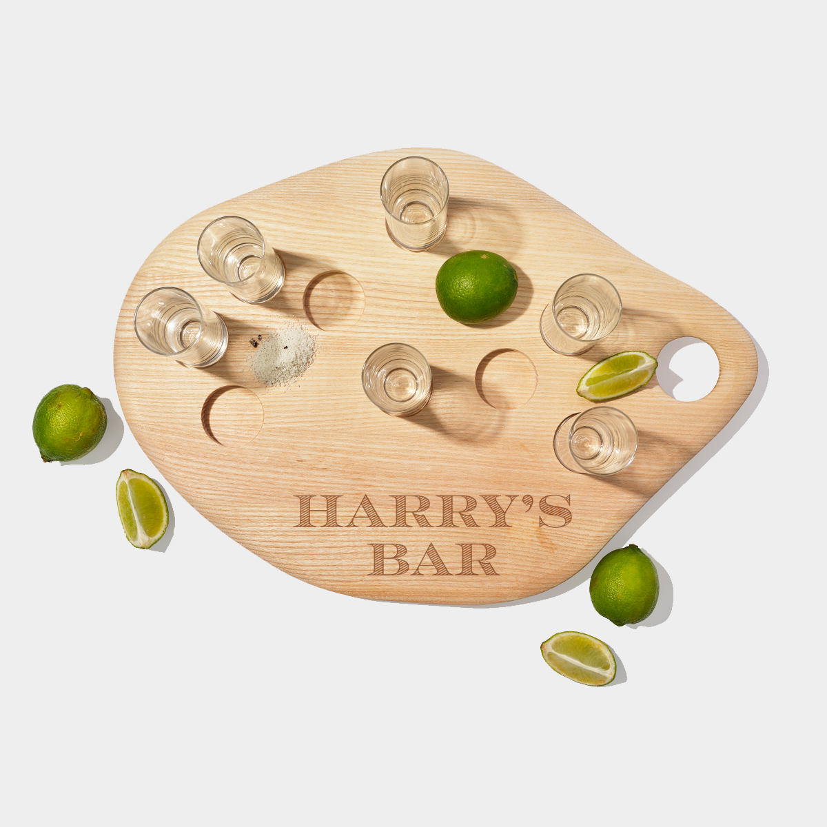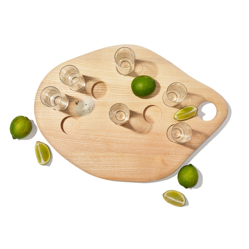 A contemporary mixed material design inspired by the form and function of the traditional artists paint palette. The cylindrical shot glasses sit on an organically-shaped natural ash board with a thumb hole that is designed for ease of carrying.