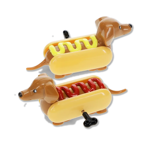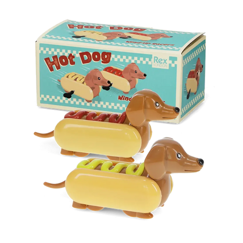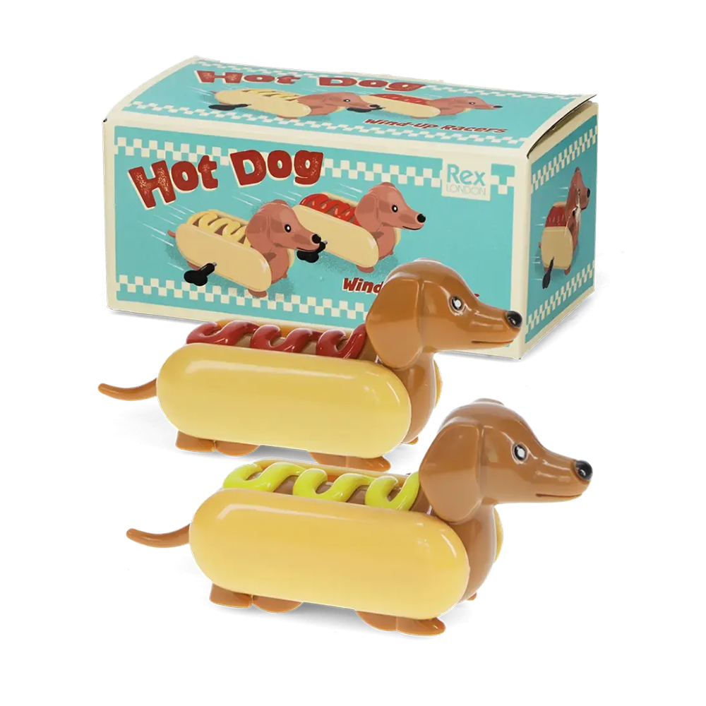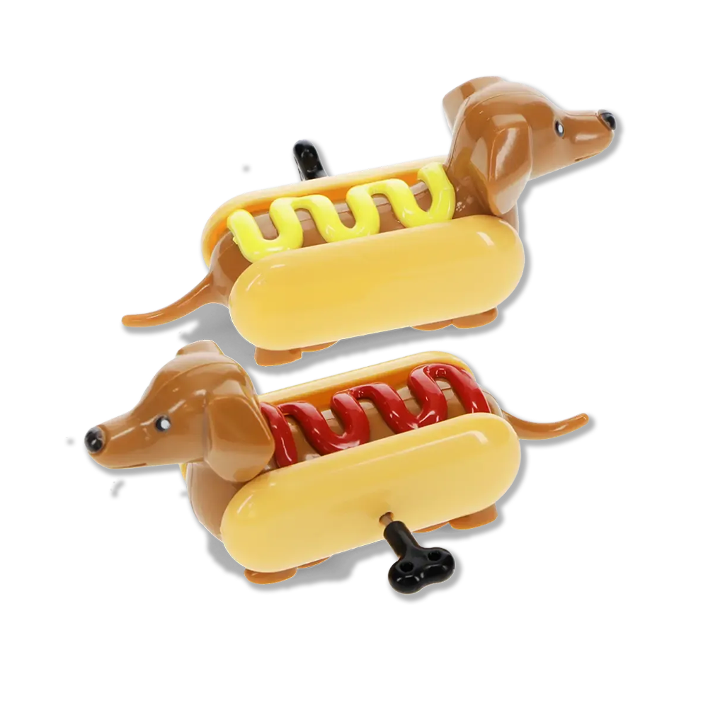Ready, set, race! This set of two wind-up hot dog racers is perfect for some competitive fun at home or on the go. Just wind them up and watch them zoom – no batteries needed.