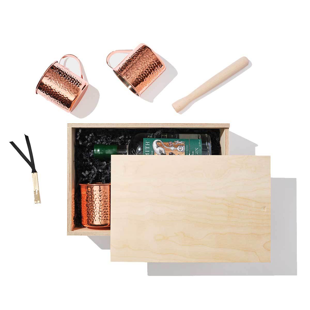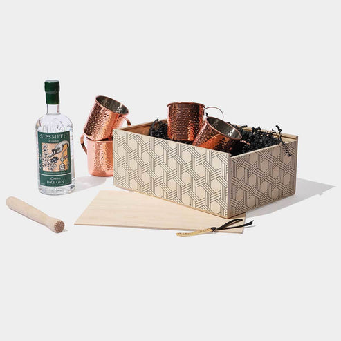 The perfect gin cocktails selection with 70cl of Sipsmith London Dry Gin, four hammer mugs and a full cocktails set all in a rose gold finish. This selection of gifts all comes beautifully wrapped and nailed shut in a wooden hamper, with accompanying gold plated crow for the chicest opening. Have your hamper personalised with a message to make the ultimate gift.