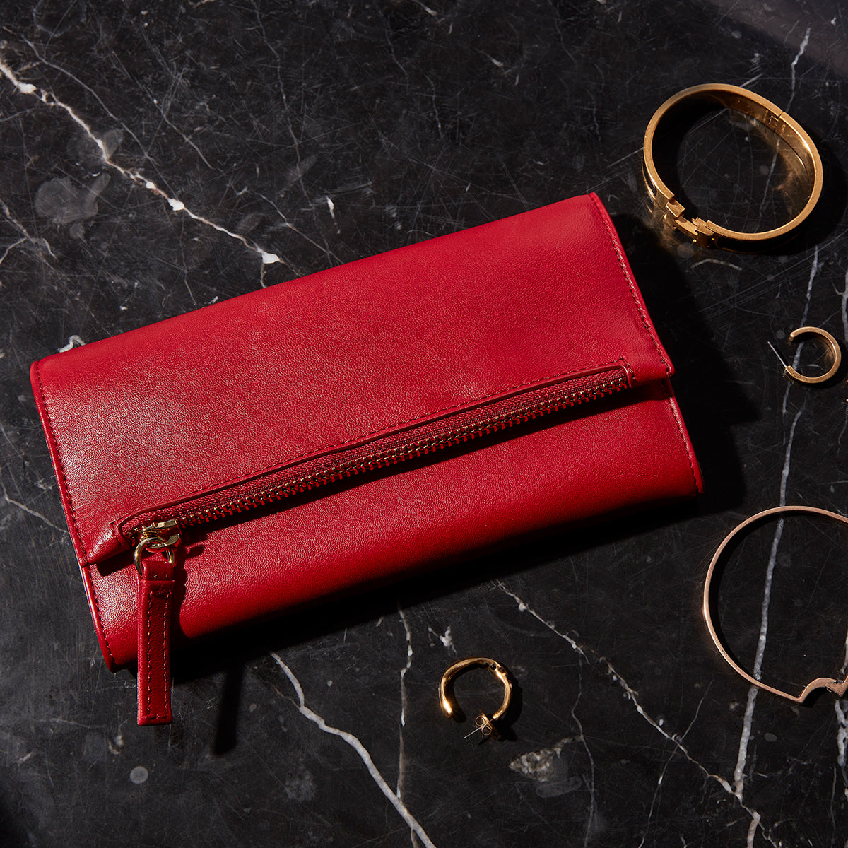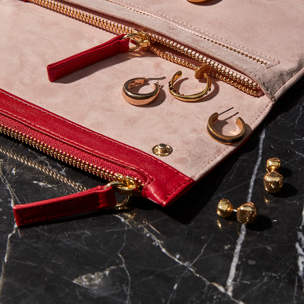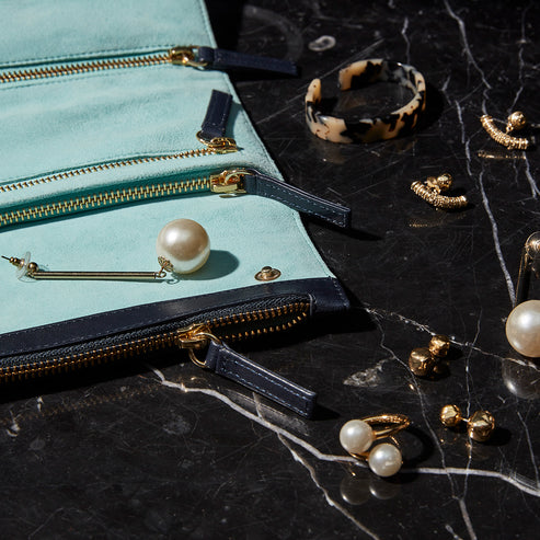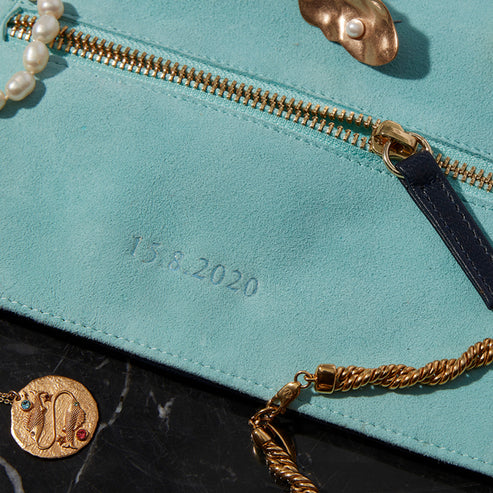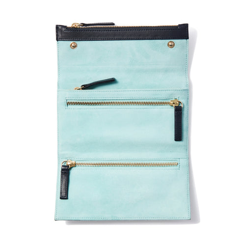 Made from buttery soft sheep leather on the outside with a colourful suede interior that can be personalised. Features four zipped compartments that range in size, from smaller pockets for rings and earrings to a larger central compartment which can securely hold necklaces bangles and watches.