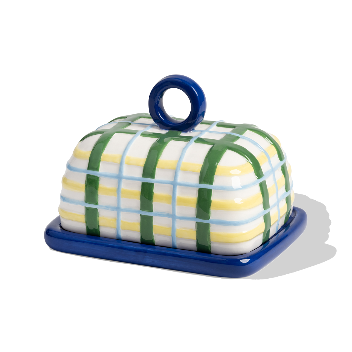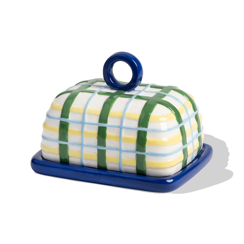 The butter dish plaid brings a modern and fresh look to your dining table. Made from high-quality glazed dolomite, this butter dish exudes durability and style. The graphic pattern adds a touch of whimsy. Complete with a small plate and matching lid to keep your butter fresh, this set is the perfect addition to elevate your everyday meals with a touch of elegance. Available in two colours.