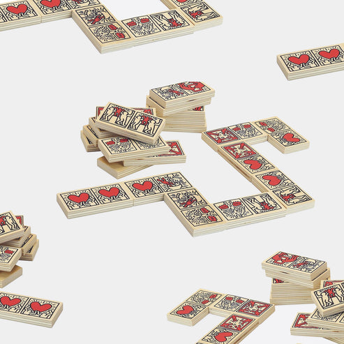 Enjoy a more playful game of dominoes with pieces adapted from some of Haring's most beloved works. A cheerful set of tiles that will be instantly recognisable to anyone familiar with the artist. Crafted of wood by the venerated toy firm Vilac, the 21 piece set includes a wooden box to hold the pieces when not in use that features the artist's work on it's exterior.