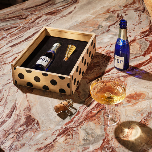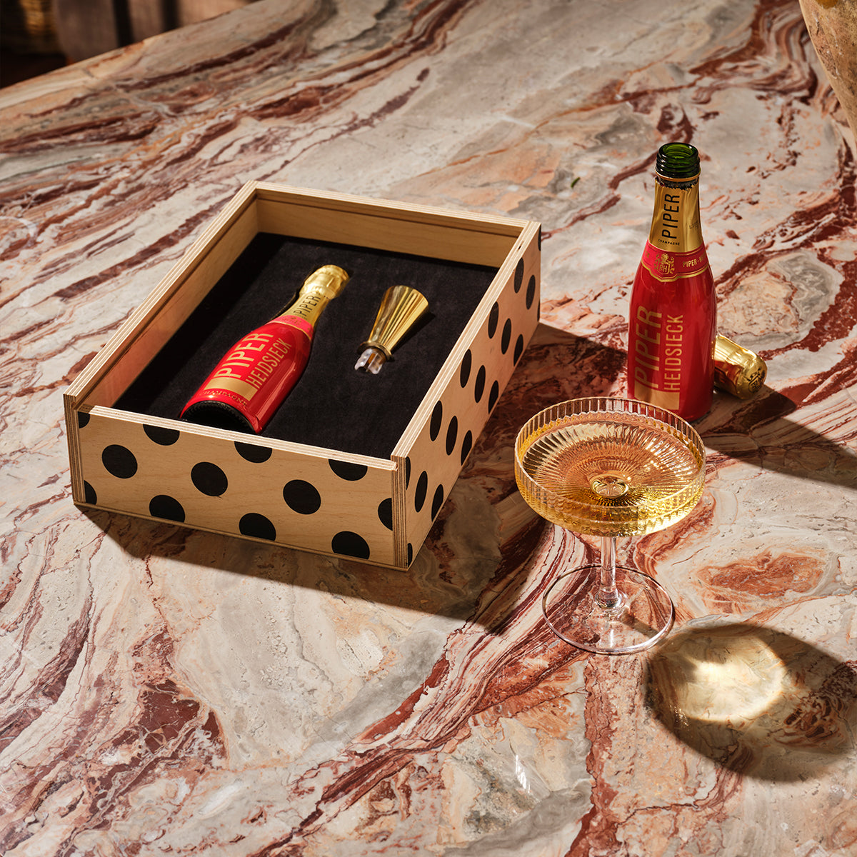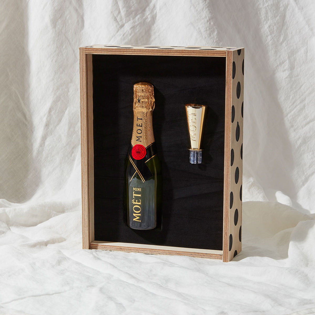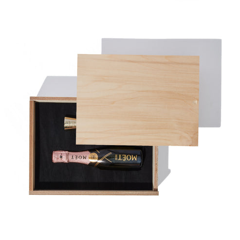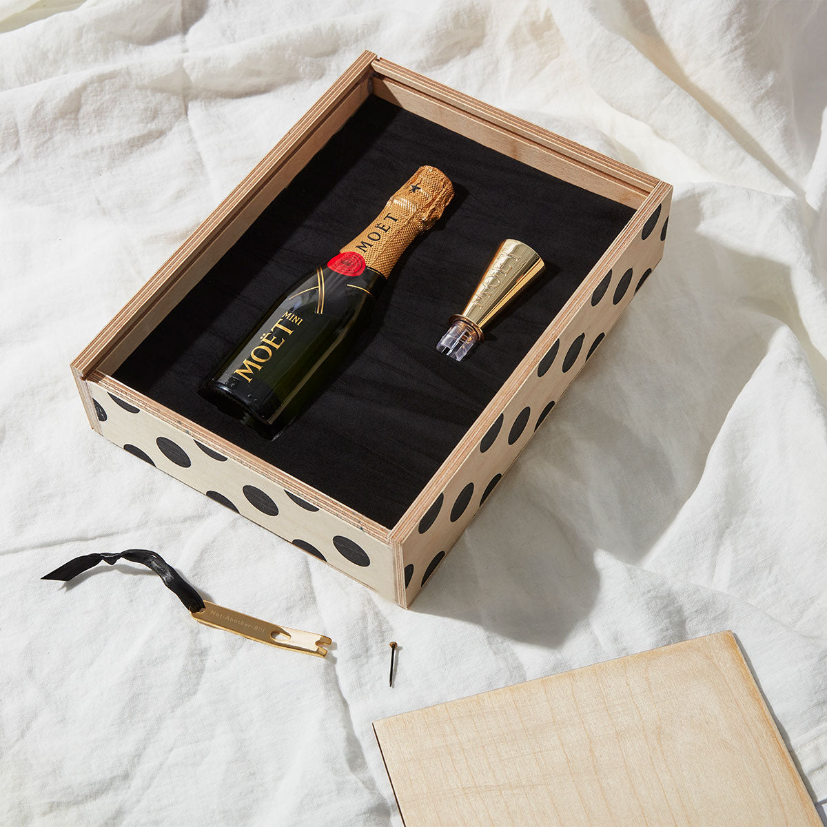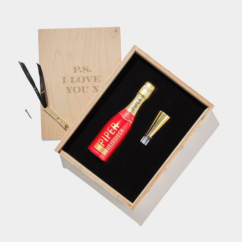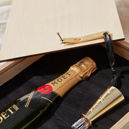 Deliver the ultimate showstopper gift with this personalised Mini Champagne Hamper with a sipper. The set comes packaged in a special edition wooden hamper and a gold-plated crowbar to prise open the lid.
