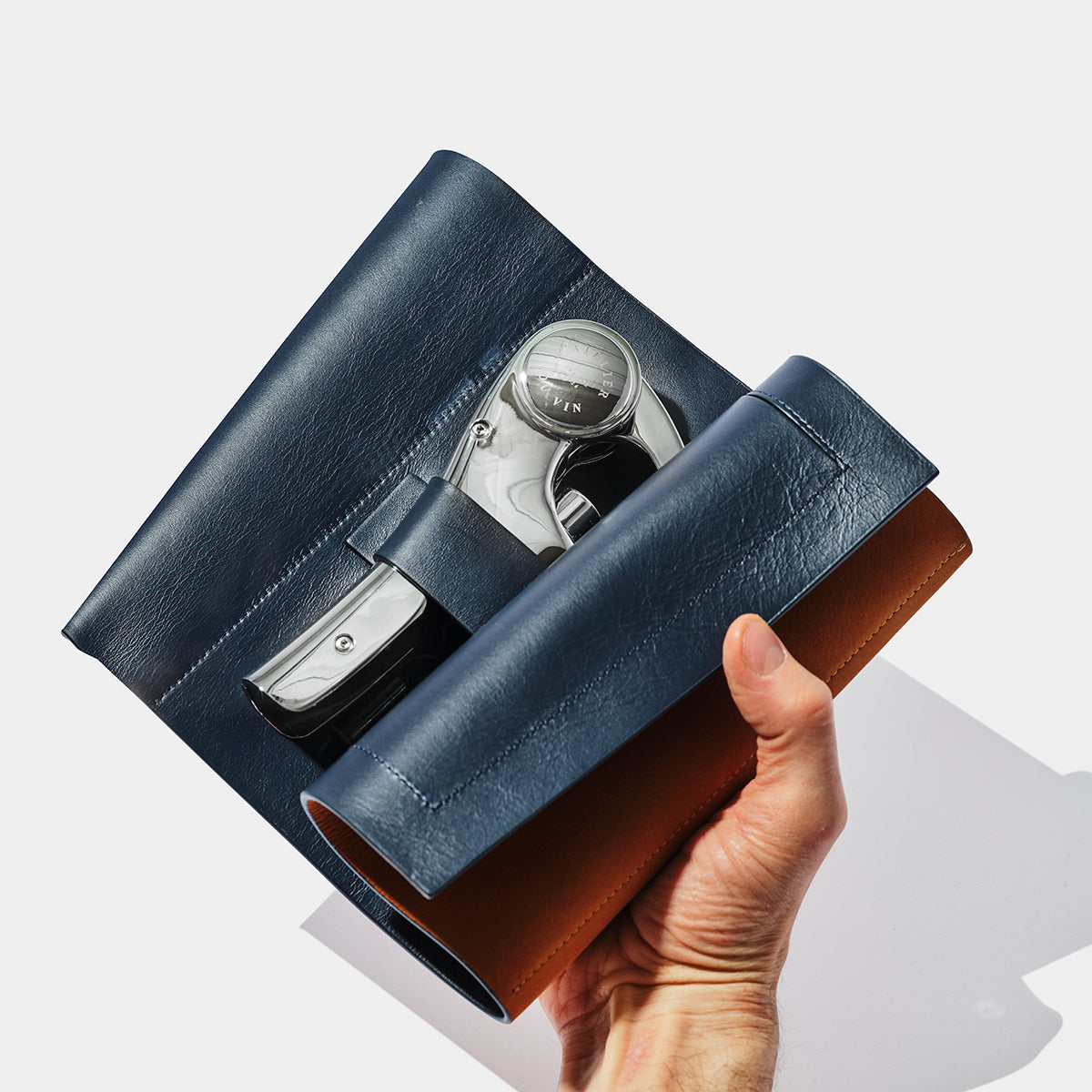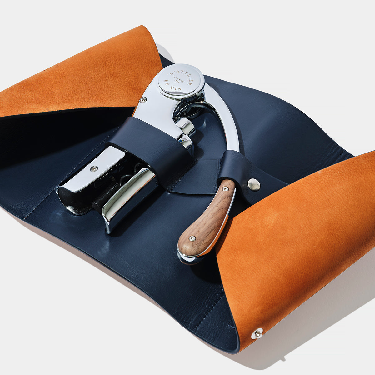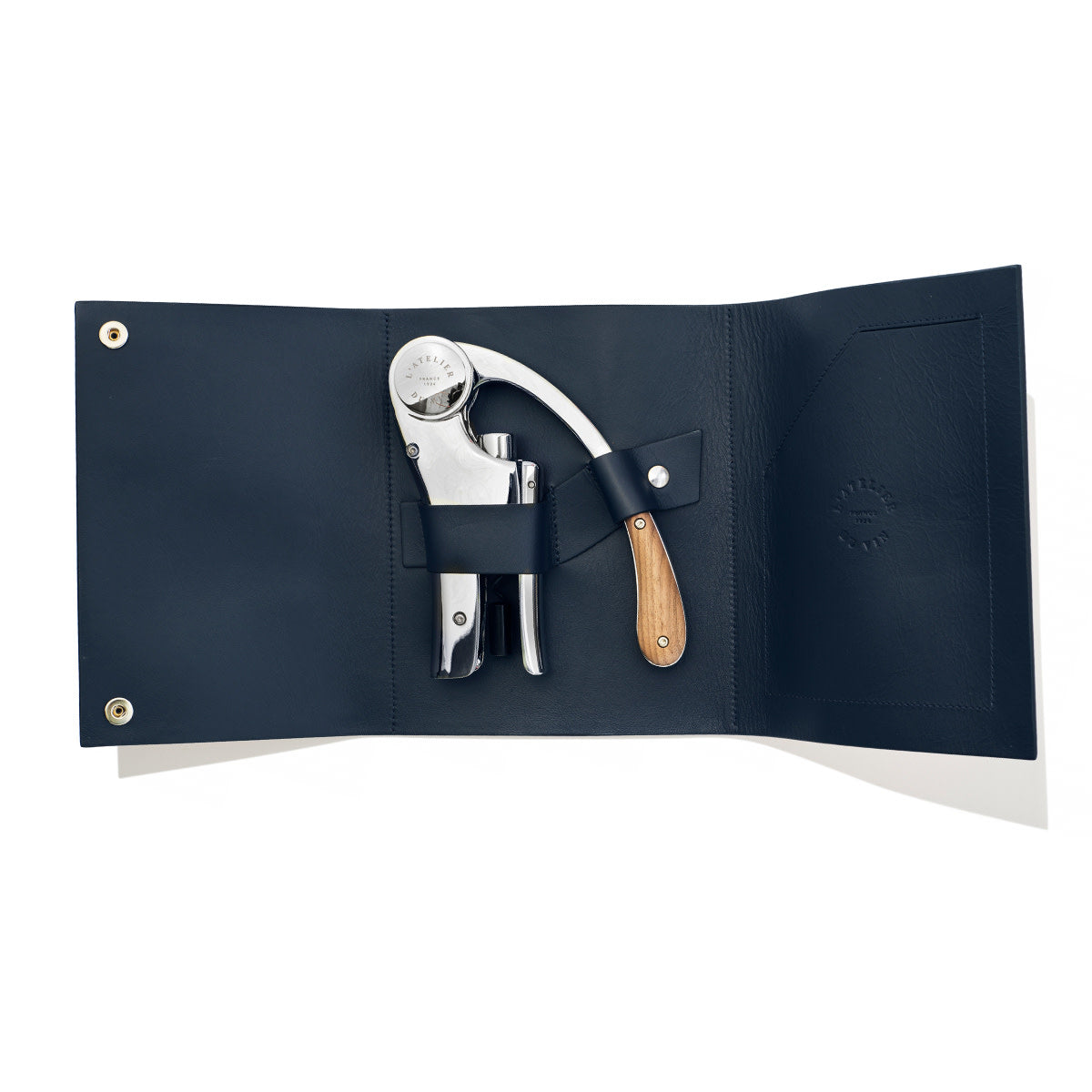 L'Atelier du Vin's limited-edition 'Nomad' kit includes the Oeno Motio lever corkscrew neatly secured inside a beautiful leather travel pouch. It's made from stainless steel metal and walnut wood.