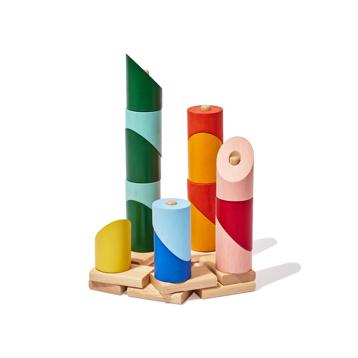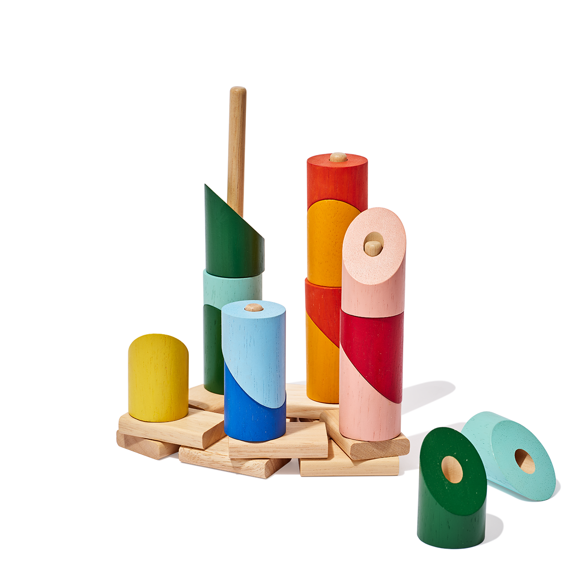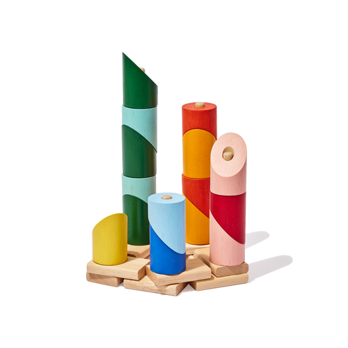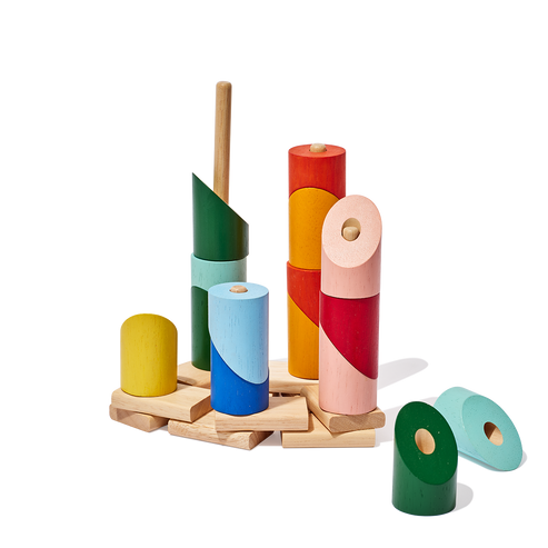 Place the colourful sliced cylinders onto the corresponding height rods, the shortest rod is for one yellow piece, and the highest rod is for the 5 green pieces. Each rod stands separately and can be linked into a long chain. This toy promotes eye-hand coordination, basic colour and mathematics skills.