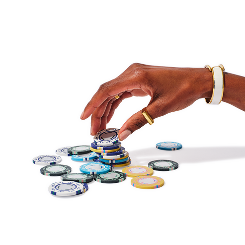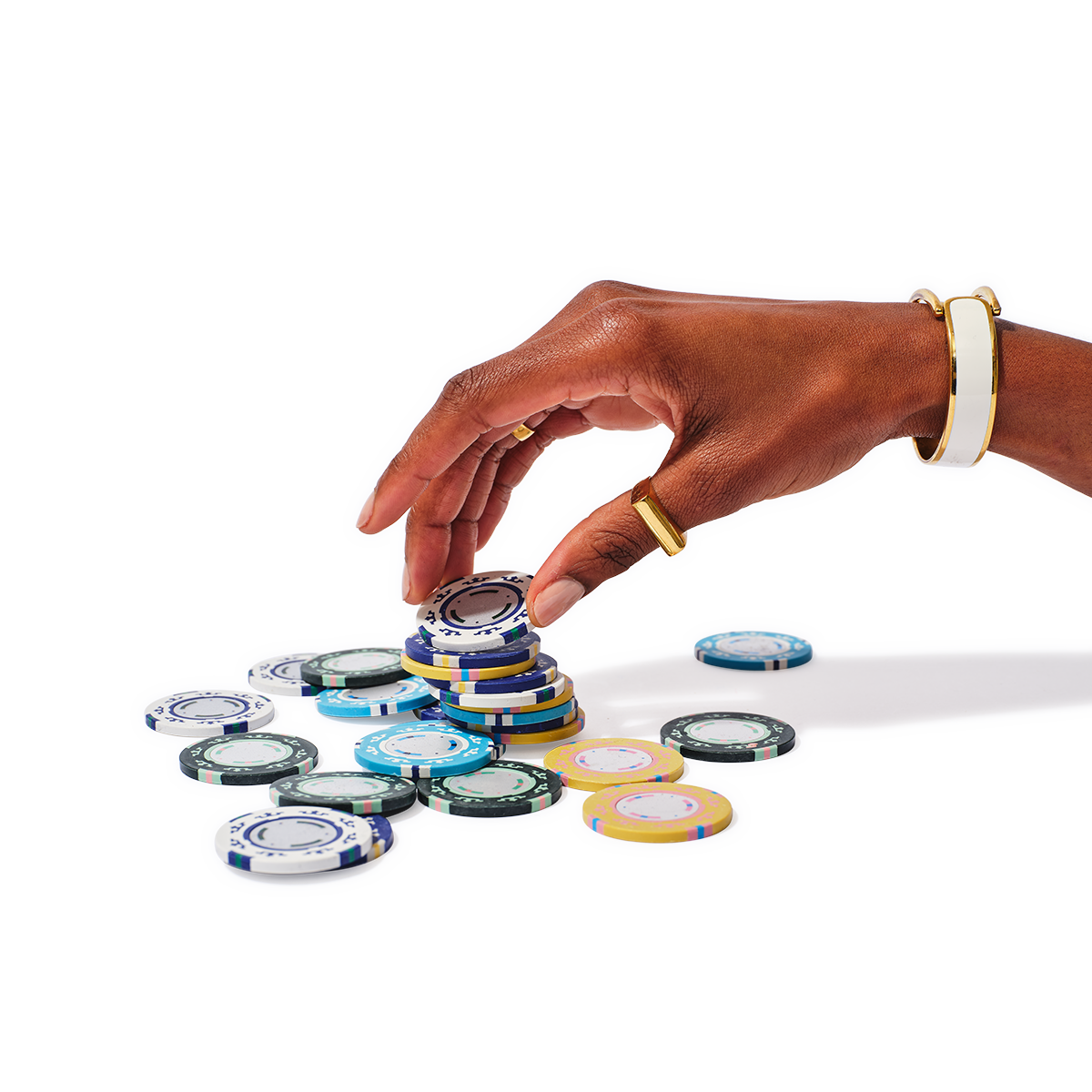 - Includes: 4 sets of 25 poker chips, 2 packs of playing cards & 4 brass dice