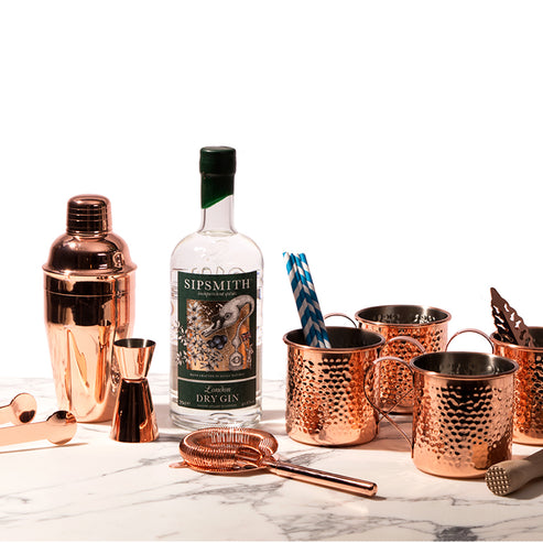 The perfect gin cocktails selection with 70cl of Sipsmith London Dry Gin, four hammer mugs and a full cocktails set all in a rose gold finish. This selection of gifts all comes beautifully wrapped and nailed shut in a wooden hamper, with accompanying gold plated crow for the chicest opening. Have your hamper personalised with a message to make the ultimate gift.