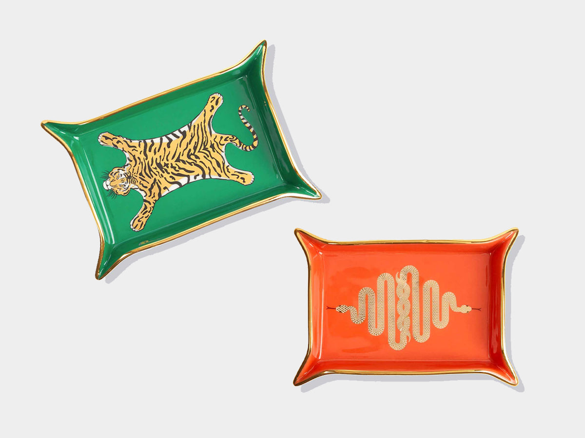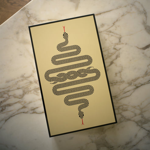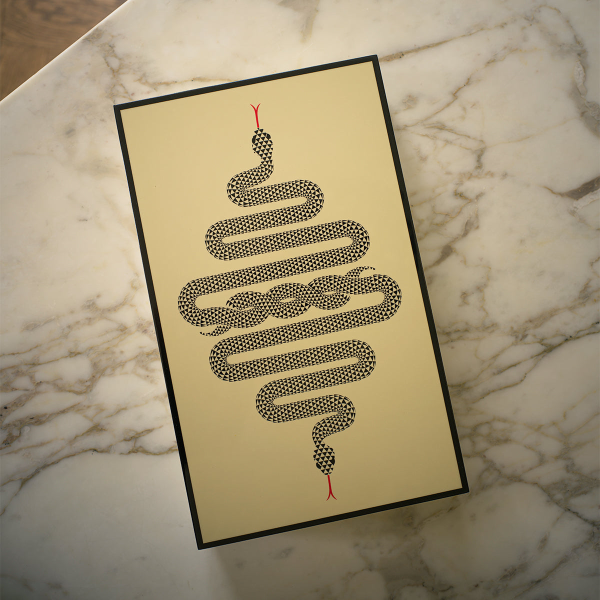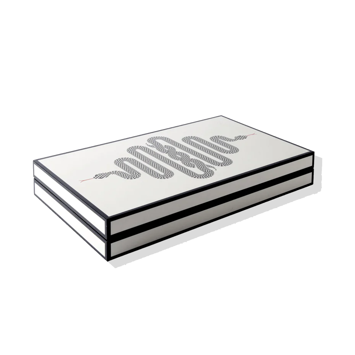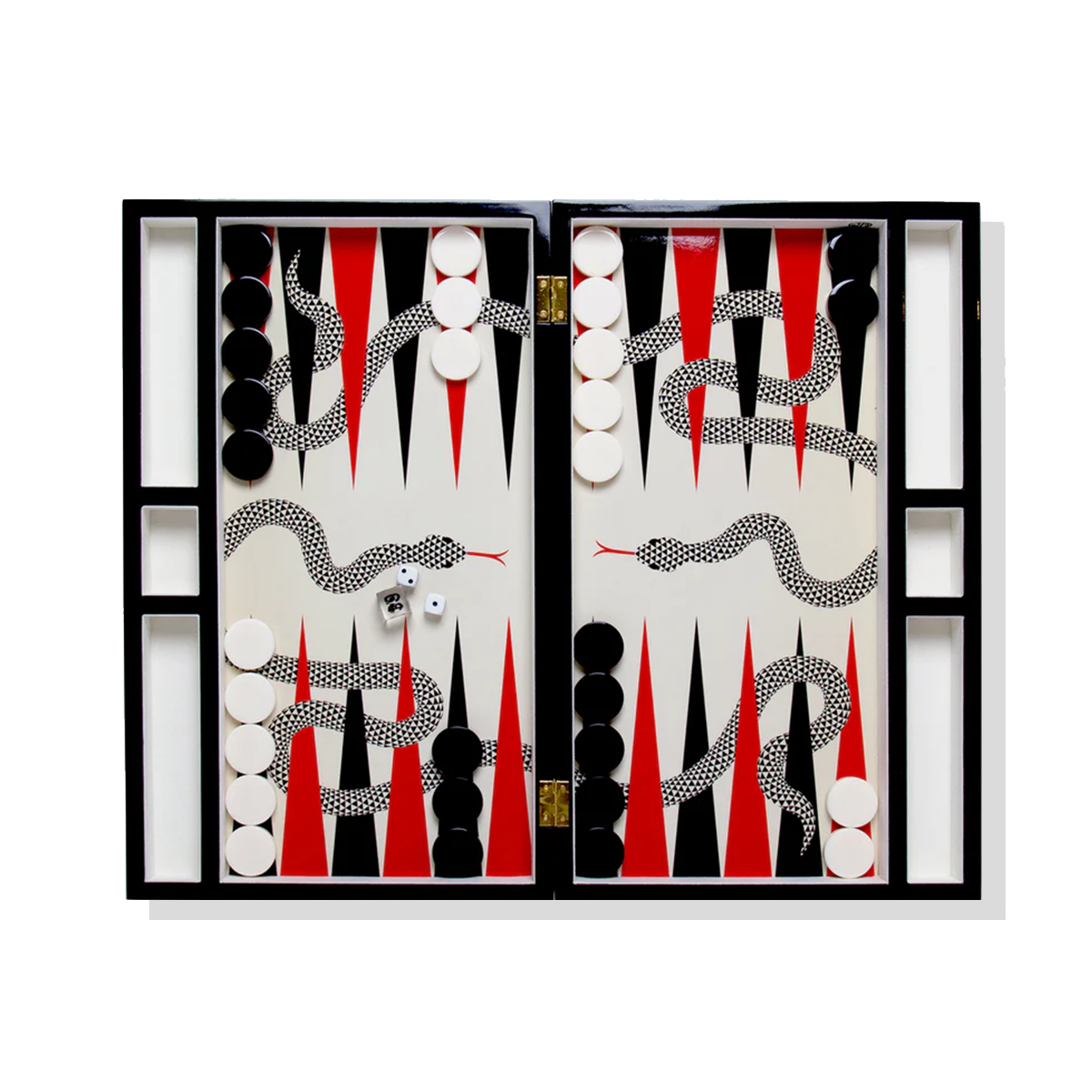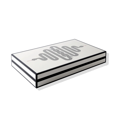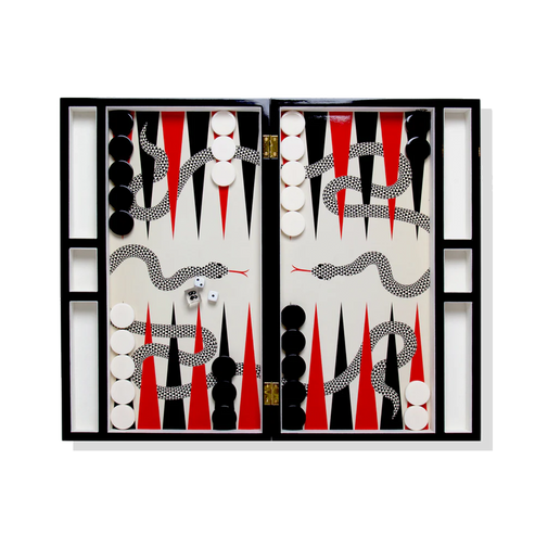 Charm your companions on game night with the Jonathan Adler Eden Backgammon Set. Crafted in couture lacquer, the high-gloss box features an intricately intertwined duo of slithering serpents. It opens to reveal a striking interior in classic black, ivory, and red, featuring our snakes head-to-head. After vanquishing your foes, fold it closed for a fierce cocktail table accent.