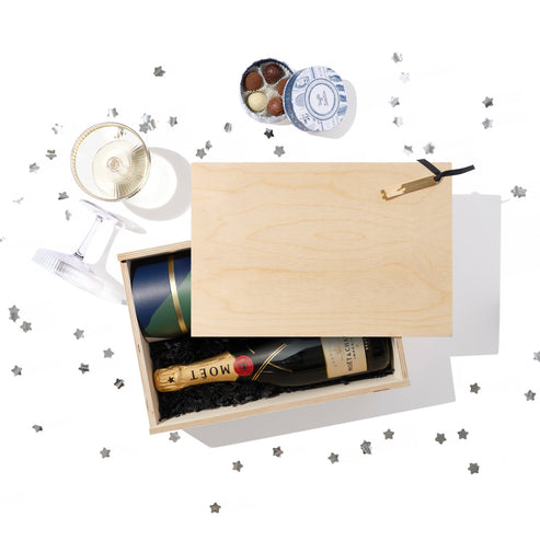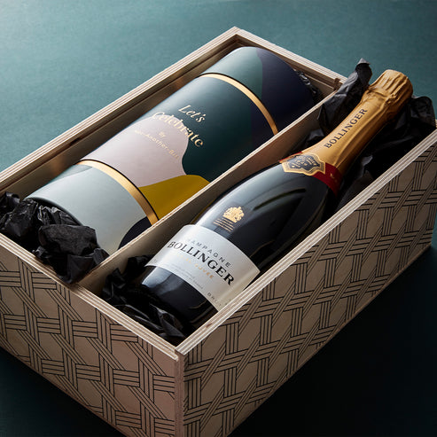 The ultimate symbol of celebration, our Champagne hamper includes a 75cl bottle of bubbles, as well as a set of two stylish glasses. Each glass has a unique ribbed pattern. Personalise the hamper lid for an extra special touch.