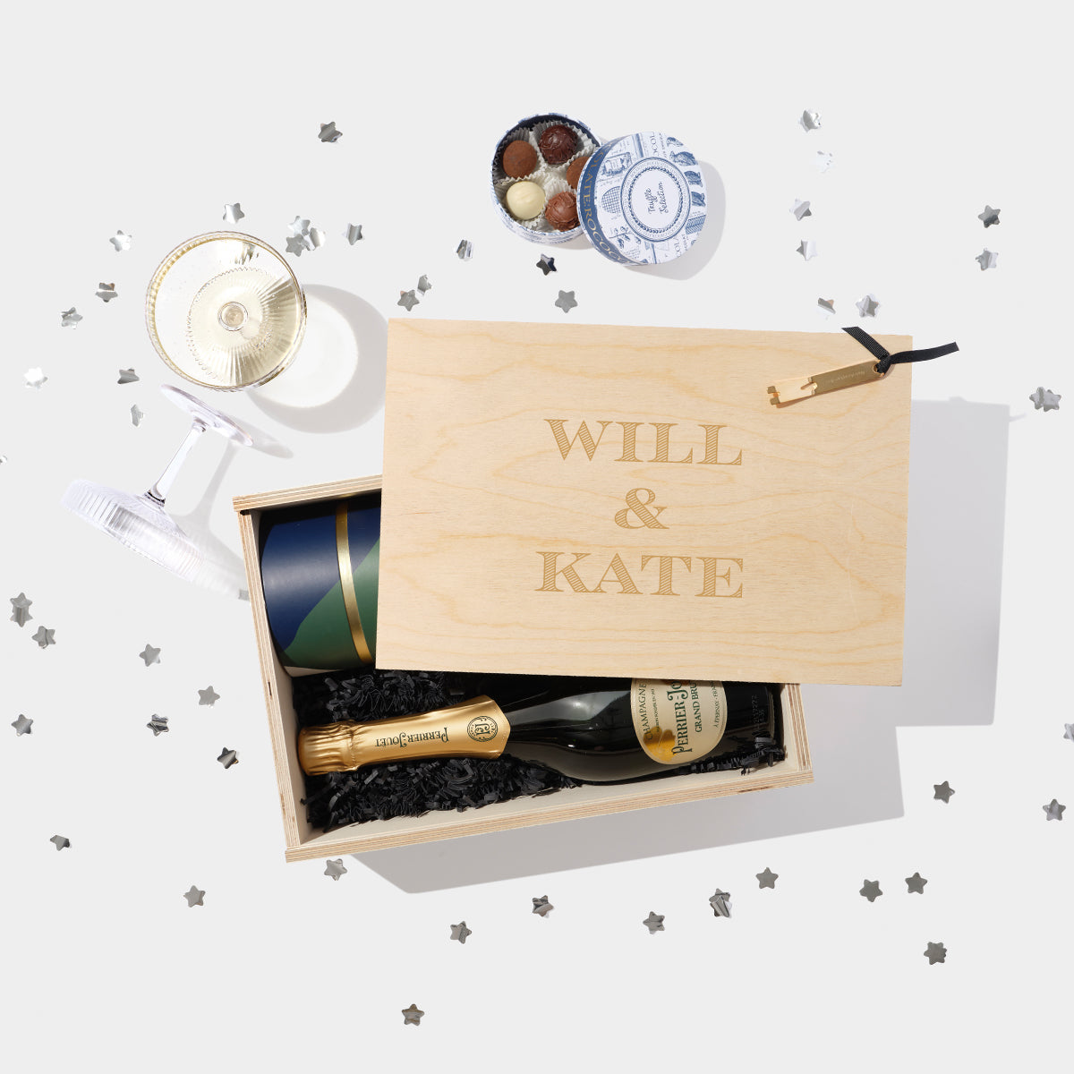 - Contents: 2x Ripple Champagne Glasses & 75cl Selected Bottle of Champagne, Rococo mini salted caramel truffles