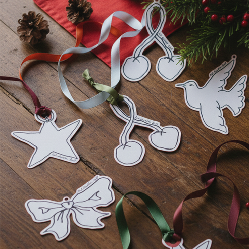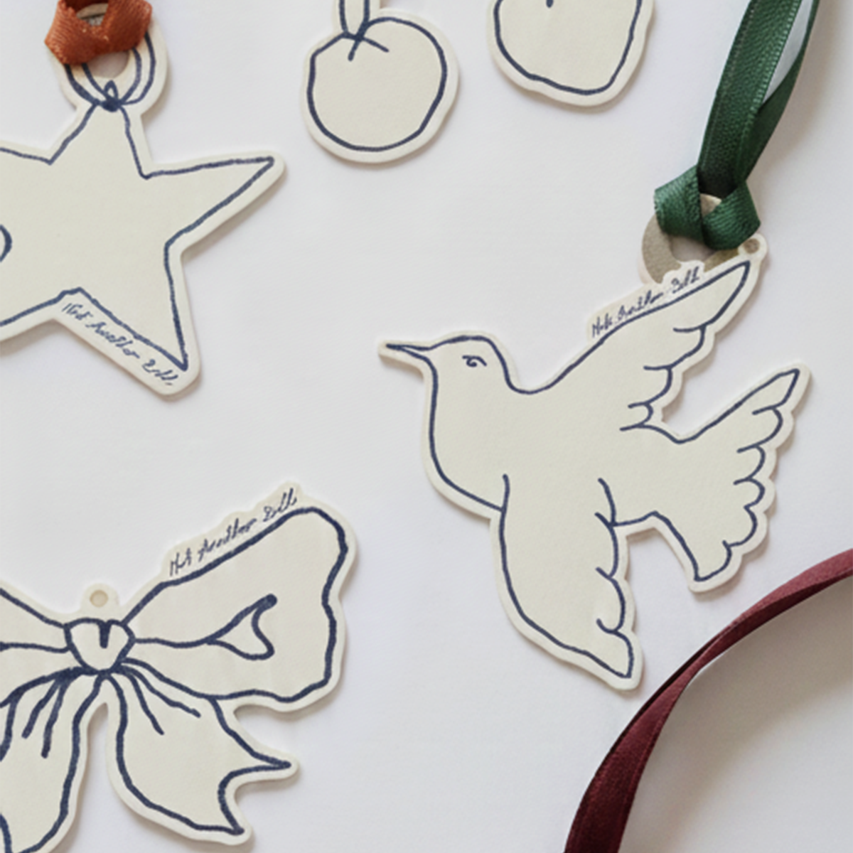 A charming set of five die-cut gift tags, printed on 350gsm GFSmith paper and tied with contrasting ribbons. Perfect for looping onto gift boxes, bags or bottles, each tag adds a thoughtfully curated finishing touch.