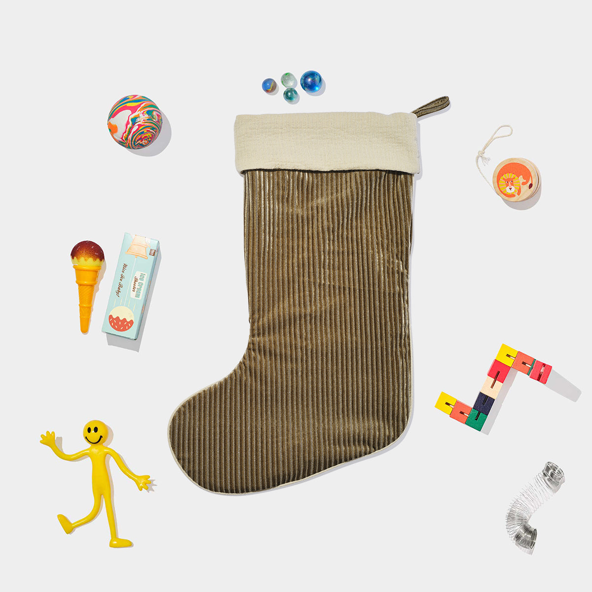 Our Christmas Stocking is luxuriously crafted with a metallic velvet outer and organic cotton lining, with contrasting piping and a velvet loop for hanging above your fireplace. Make it truly special with an embroidered name for a seasonal look that remains timeless.