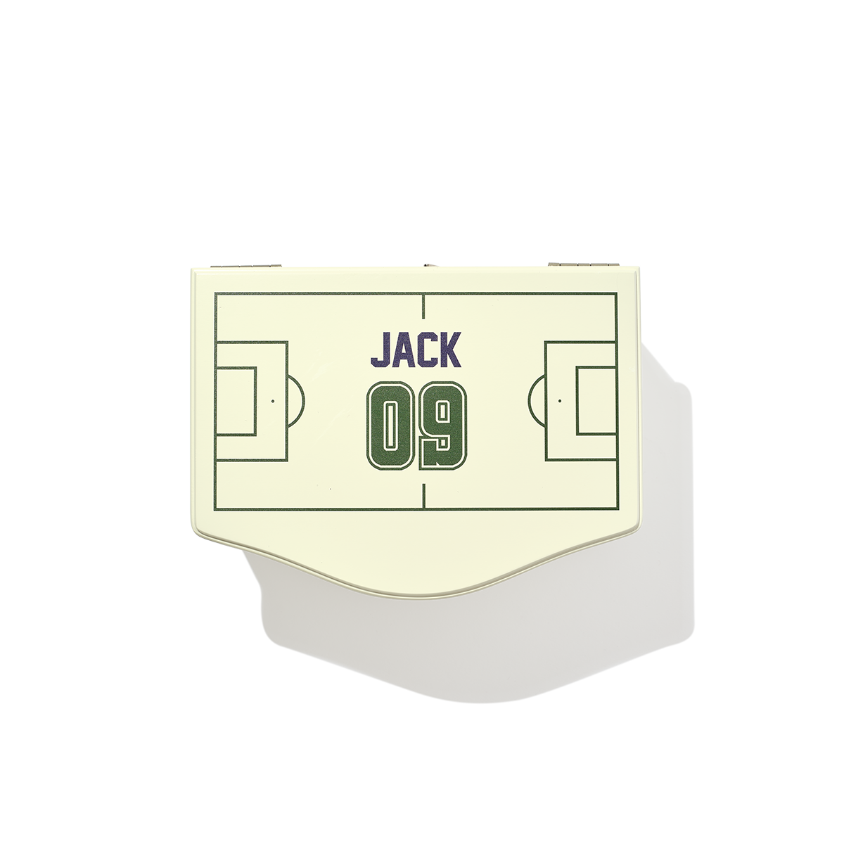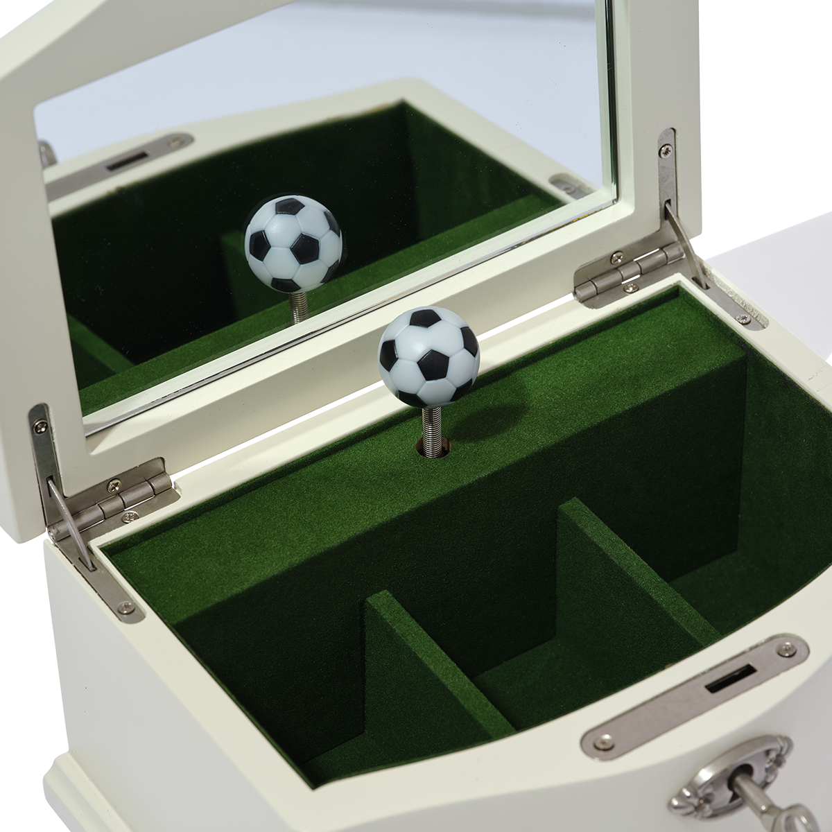 This modern twist on the classic wind-up music box swaps the ballerina for a miniature football scene that comes to life as it plays “We Are The Champions.” Open the lid to reveal a mirror and handy storage compartments perfect for small keepsakes. Personalise the top with a football-shirt style name and number - a winning gift for any football fan.